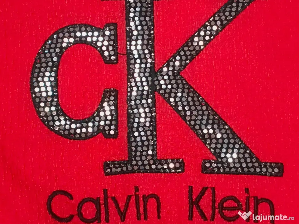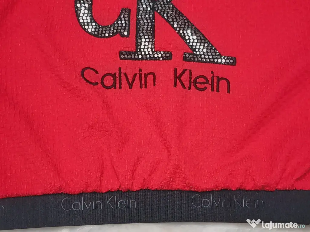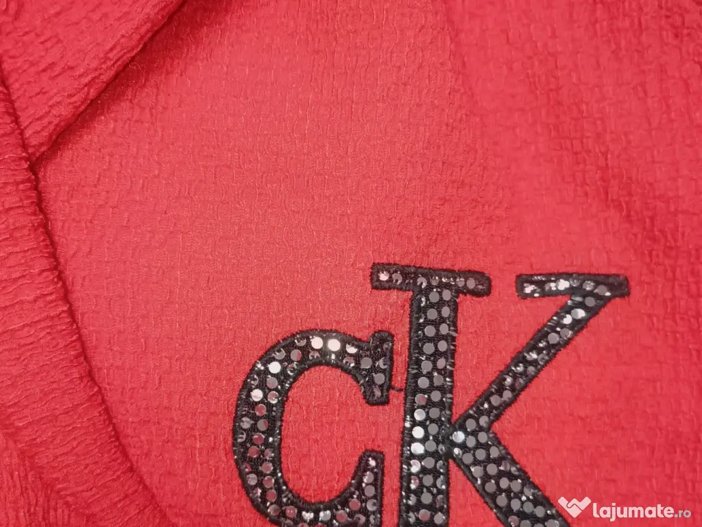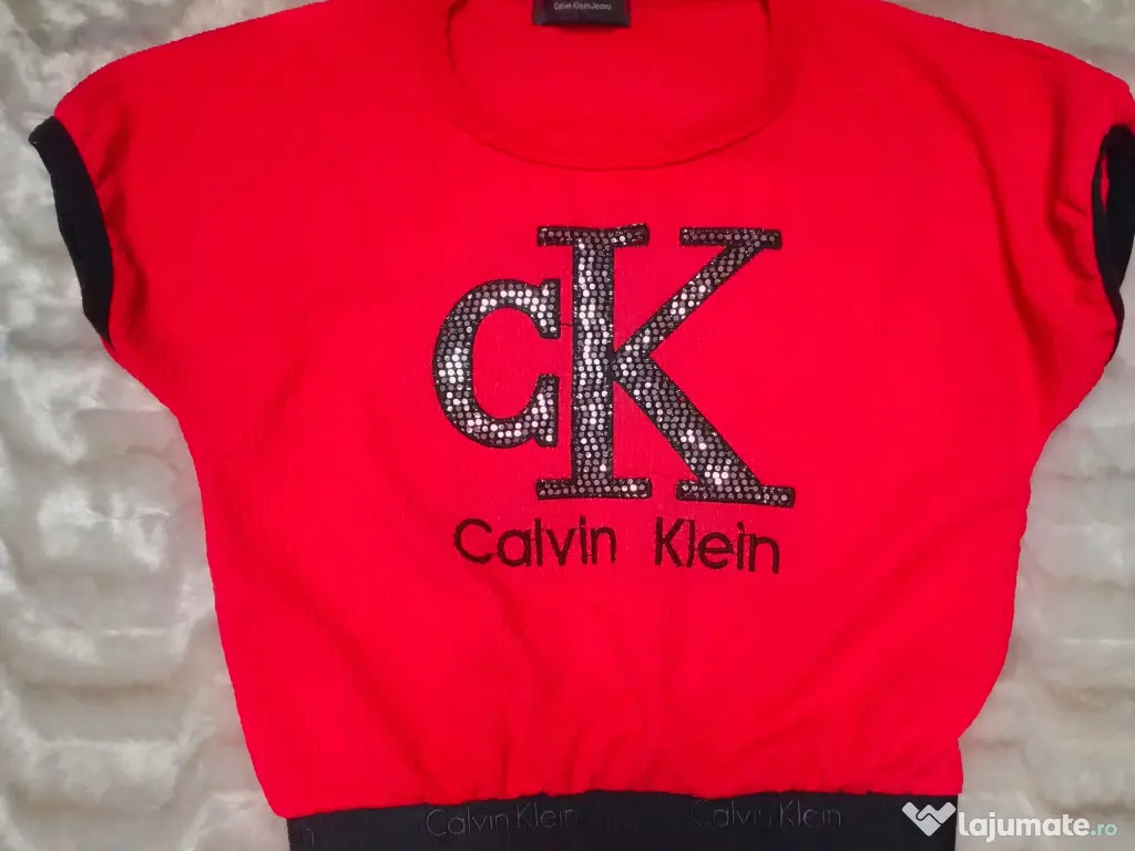 - Bluză tip Top, cu croială modernă, scurtă, cu logo CK din strasuri strălucitoare și bandă elastică lată sub bust, gravata pe toată lungimea ei cu logo brand.