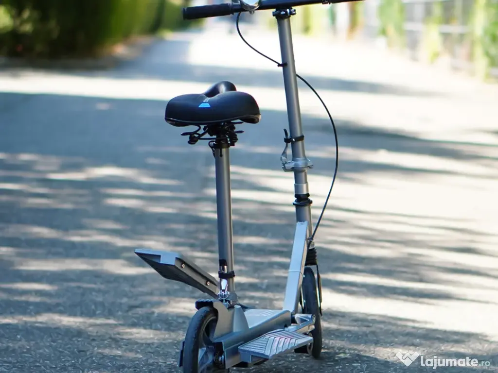 Versatilitate unică: Scaunul reglabil și pliabil transformă trotineta într-un mijloc de transport adaptabil nevoilor copilului tău, de la mic la mare.