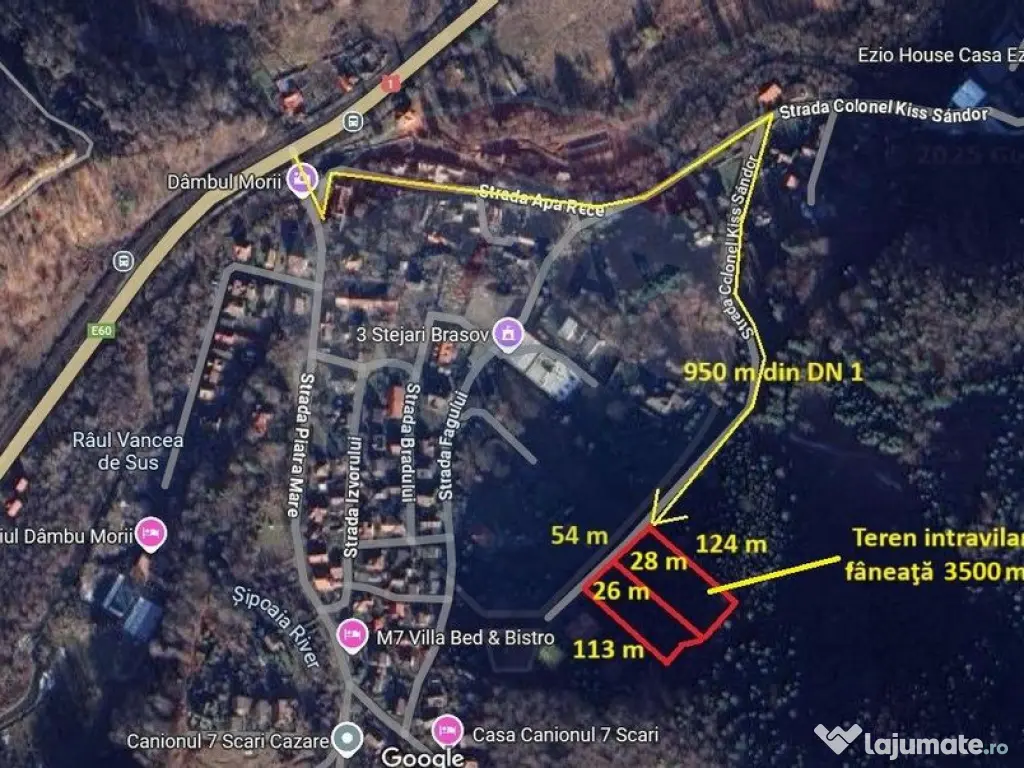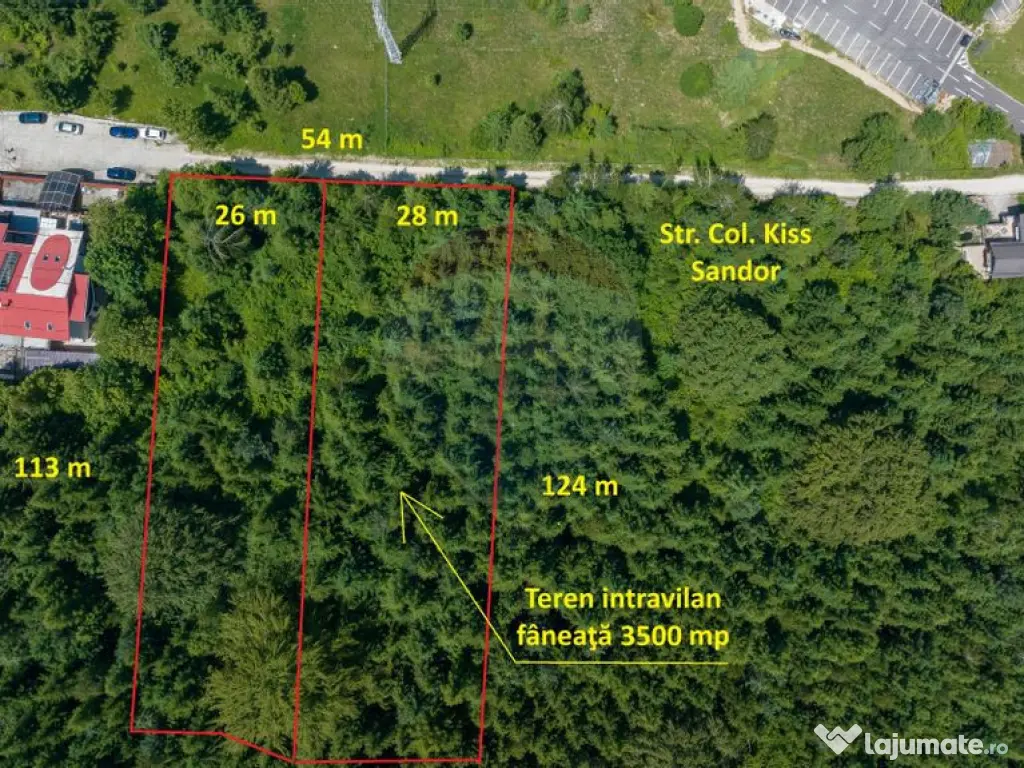 Teren intravilan, fâneaţă, neîmprejmuit, 3500 mp, situat la Dâmbu Morii, cu front de 28 m la strada Colonel Kiss Sandor şi adâncime de 124 m şi 123 m. Destinaţie conform PUG – UTR 40 – zona pentru construcţii turistice, vile, pensiuni şi dotări turistice. Necesar PUZ. Curentul, apa, canalizarea sunt la teren.