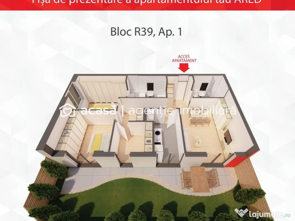 Imaginează-ți liniștea unei grădini private, la câțiva pași de viața vibrantă a orașului. Descoperă singurul apartament de la parter cu grădină și terasă proprie, situat în complexul rezidențial ARED City, zona IMAR, disponibil direct de la dezvoltator. Blocul este în construcție, predarea apartamentului se face pe data de 30.11.2026. * 3 camere * Suprafață utilă: 87 m² * Grădină: 55 m² – spațiu perfect pentru relaxare * 2 băi, 1 bucătărie * Orientare nord-est – lumină naturală echilibrată * Varianta nefinisată – îți amenajezi locuința exact așa cum îți dorești * Loc de parcare inclus în preț De ce acest proiect face diferența: • Proiect imobiliar de anvergură europeană, dezvoltat de ARED • Bloc nou, ultramodern, în construcție, cu standarde de eficiență energetică (termoizolație 20 cm) • Singurul apartament la parter cu grădină proprie – spațiu personal pentru relaxare, familie, hobby sau work-from-home • Complex supravegheat video, cu 4 căi de acces pentru siguranță și fluiditate • Parc amenajat chiar lângă complex, pentru timp liber și natură la îndemână • Conexiuni rapide către AFI Mall, restaurante, sală de fitness, mijloace de transport și zone de business Flexibilitate la achiziție: • Nefinisat – dacă vrei să-l personalizezi de la zero • Finisat – dacă vrei să te muți rapid • Complet mobilat – dacă vrei soluția “gata de locuit” Pret fără TVA: 242.921€ pt. varianta NEFINISAT ATENȚIE! Poze cu titlu ilustrativ. Pentru detalii: Jasmina Uglesits - 0740814770 Consultant imobiliar - Agenția ACASĂ Arad Nu dispui de toată suma? Te ajutăm noi gratuit! Îți obținem oferte de la 16 bănci. Ai o proprietate de vânzare în Arad și vrei să știi cât valorează cu adevărat? Sună-mă pentru o evaluare gratuită, fără obligații. Birou: ACASĂ | Agenție imobiliară Arad Bulevardul Decebal 2, Arad 310133 Confort: Lux Tip imobil: Bloc de apartamente Număr Băi: 2 Posibilitate parcare: Nu