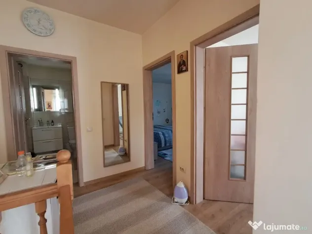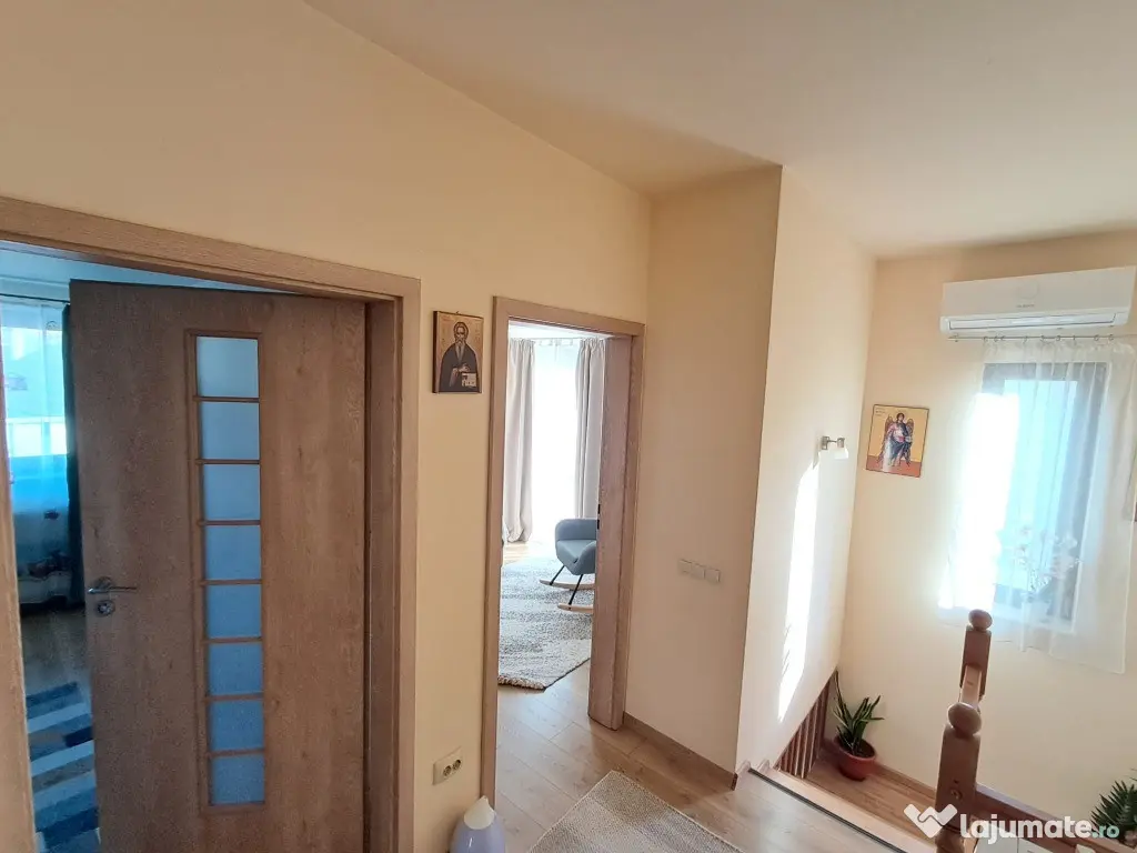 Compartimentare: parterul are hol, baie, bucatarie, dinning, living, spatiu depozitare sub casa scarii, iesire in gradina din living room; etajul are hol, 2 dormitoare si baie.