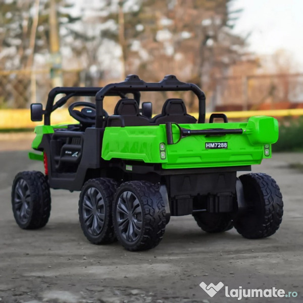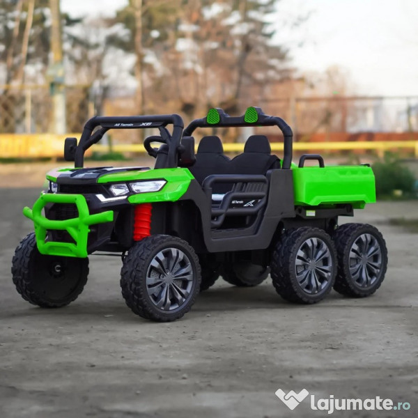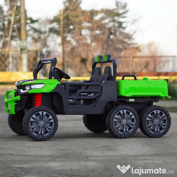 Benficiati de GARANTIE 24 Luni Transport GRATUIT Pentru comenzi si info contactati-ne 0729189471 UTV electric pentru 2 copii Kinderauto X-Force 4x75W 24V 4 motoare electrice de 75W fiecare la tensiune 24V, total 300W 24V Bancheta dubla, tapitata cu piele ecologica, confortabil pentru 2 copii Roti moi din cauciuc EVA, silentioase si confortabile Music player Mp3 cu conexiune Bluetooth, port USB Comutator pentru reglaj viteza, High / low speed Indicator nivel baterie prezent pe music player Control divertisment, control volum sonor din music player Buton On/off sistem de alimentare 24V (pornire/oprire) Pedale pentru acceleratie Sistem de amortizare Dupa eliberare pedala de acceleratie, tractorasul incepe sa se infraneze Comutator pentru schimbarea sensului de mers inainte sau inapoi Bascula actionat electric din buton Hoaionul se deschide Suport pentru lopata (lopata inclusa) 3 trepte de viteza selectabile din telecomanda Pornire LENTA pentru confortul copilului Oprire LENTA pentru confortul copilului Efecte sonore la pornire Compartiment depozitare spate Produsul include INCARCATOR, LOPATA, TELECOMANDA, Instructiuni CONTROL PARENTAL prin telecomanda de la distanta Masinuta mai poate fi ghidata manual de catre copil Volan echipat cu butoane pentru activare efecte sonore Centura de siguranta Greutate proprie 28 kg Greutate total admisa 72 kg Produs recomandat pentru copii intre 36 - 84 de luni Dimensiunile produsului montat 1450 x 690 x 750 mm Puteti cumpara acest produs in RATE, fara dobanda, cu CARD de cumparaturi de la banci partenere precum: Raiffeisen / Star BT / BCR / BRD Finance / Alpha Bank /First Bank. Pentru comenzi si info contactati-ne 0729189471 SAU IN RATE CU DOBANDA PRIN TBI PAY.