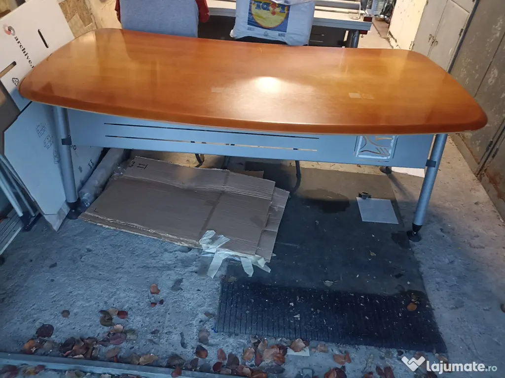 Birou executiv solid, blatul fiind din MDF furniruit lacuit si structura metalica, în stare bună, de vânzare. Masa are o suprafață mare și un design clasic, fiind potrivită pentru un spațiu de lucru profesional.