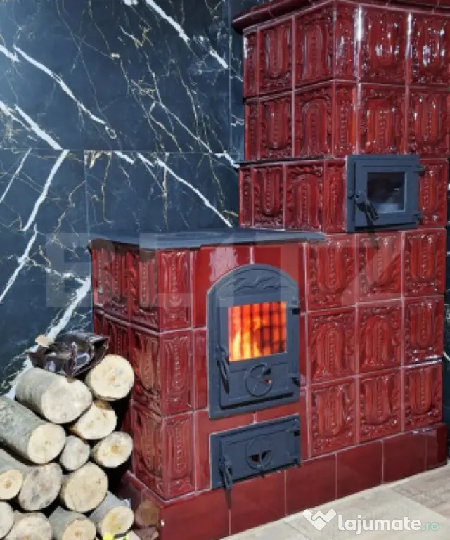 • Design Interior Remarcabil: Spre deosebire de cabanele clasice, interiorul surprinde printr-o amenajare eclectică și rafinată. De la soba spectaculoasă din teracotă roșie — piesa centrală a casei — până la finisajele premium din băi (baterii negre mate, lavoare pe blat de lemn masiv și placări ceramice stil patchwork), fiecare detaliu este gândit pentru a crea o atmosferă caldă și primitoare.