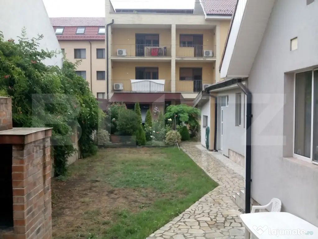 Blitz ofera spre vanzare o proprietate situata in Oradea, intr-o zona linistita, amplasata pe un teren care are suprafata de 440 mp. Proprietatea este racordata la apa, gaz, curent trifazic si canalizare. Caracteristicile imobilului: hol de acces, 3 camere, 2 bai, 3 bucatarii, sala de sport .Finisaje: tencuieli exterioare decorative în culori vii; tencuieli interioare drișcuite și gletuite; uşi exterioare PVC culoare mahon cu geam termoizolant; uşi interioare din PVC culoare mahon cu geam termoizolant; ferestre din PVC culoare mahon cu geam termoizolant și rulete din PVC; pardoselile din parchet laminat în camere şi spaţii de trecere; pardoseală din gresie la grupurile sanitare, bucătării și casa scării; faianţă la grupurile sanitare și bucătării; zugrăveli superioare lavabile la pereţii interiori; instalaţia de aer condiționat; instalaţia sanitară este echipată cu obiecte sanitare moderne; instalaţia de încălzire centrală cu radiatoare și centrală termică proprie pe gaz. Va asteptam la vizionare.
