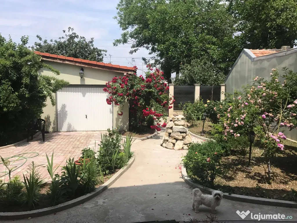 Casa beneficiaza de un sistem de panouri fotovoltaice de 3,5 kw, garaj cu 2 usi de garaj basculante, Hormann,platforma betonata interioara, curte cu flori si arbusti ornamentali, in fata casei.