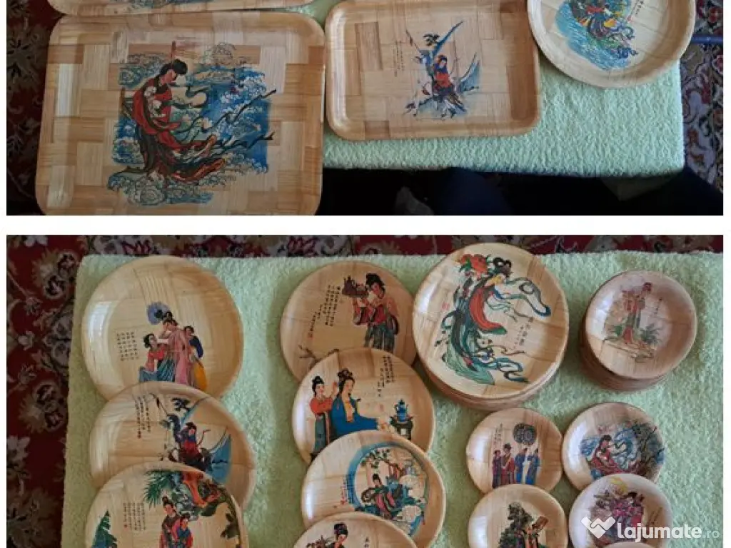 Vand urmatoarele tavi si farfuriii din lemn de bambus pictate: