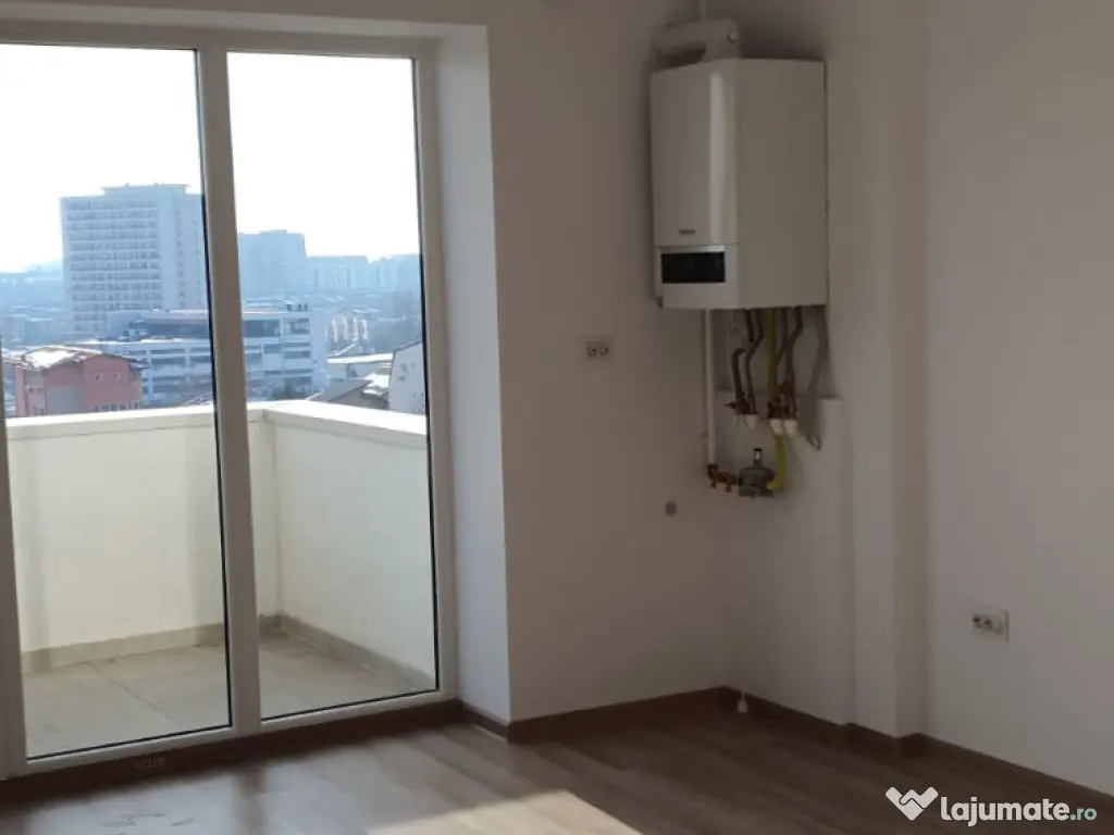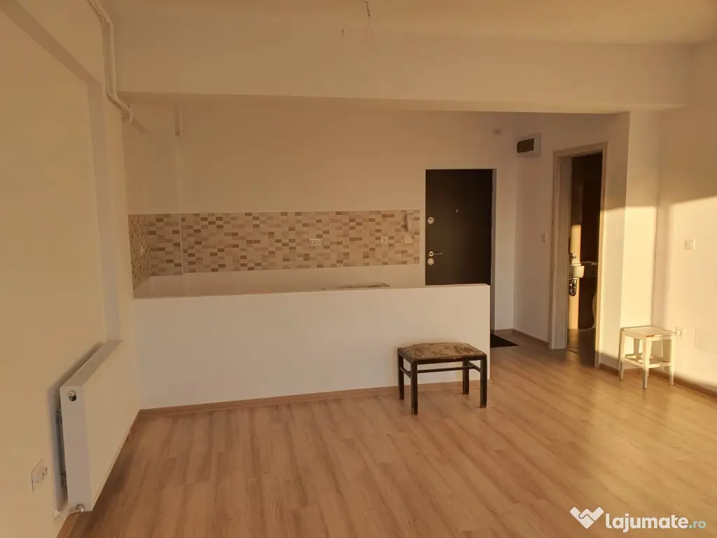 Bucătăria este open-space, dar poate fi închisă ușor pentru delimitarea zonei de living/dormitor, oferind flexibilitate în amenajare.