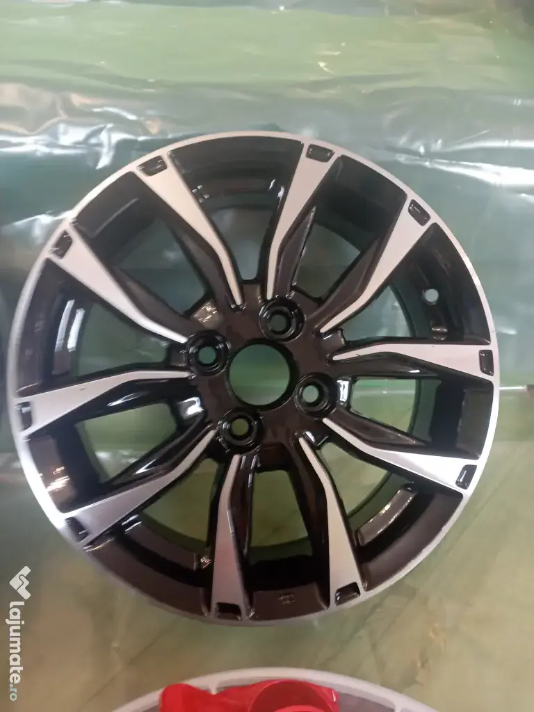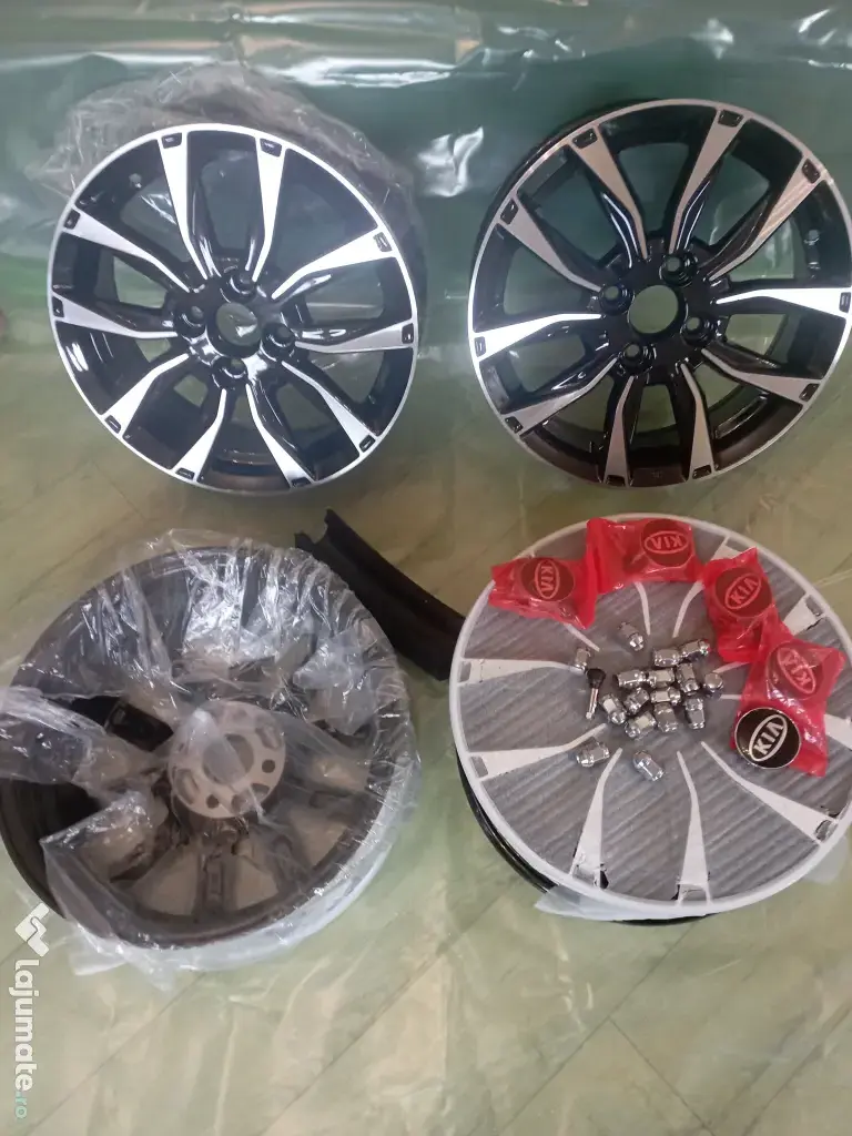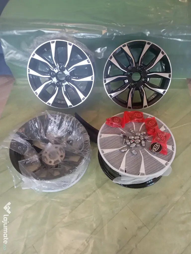 Vand set 4 jante aliaj noi, marca PDW, finisaj MB lustruit + negru, 15" 4x100 ET 45. Setul contine si 16 piulite afrente cu capace centrale ale rotilor "emblema Kia".
