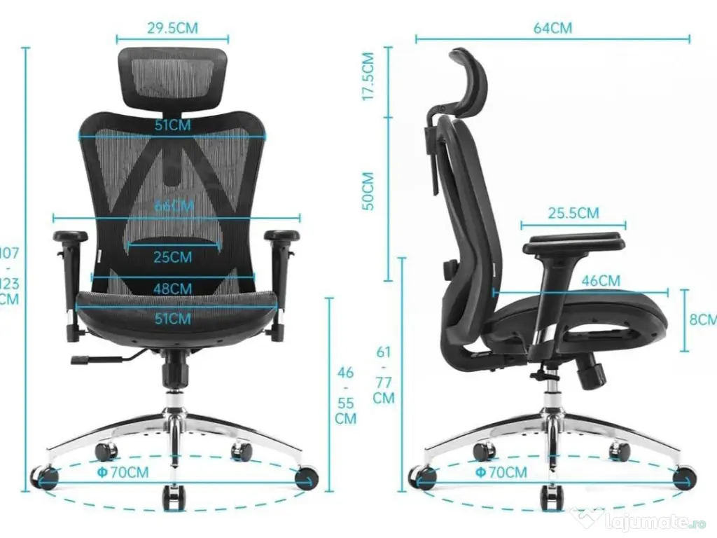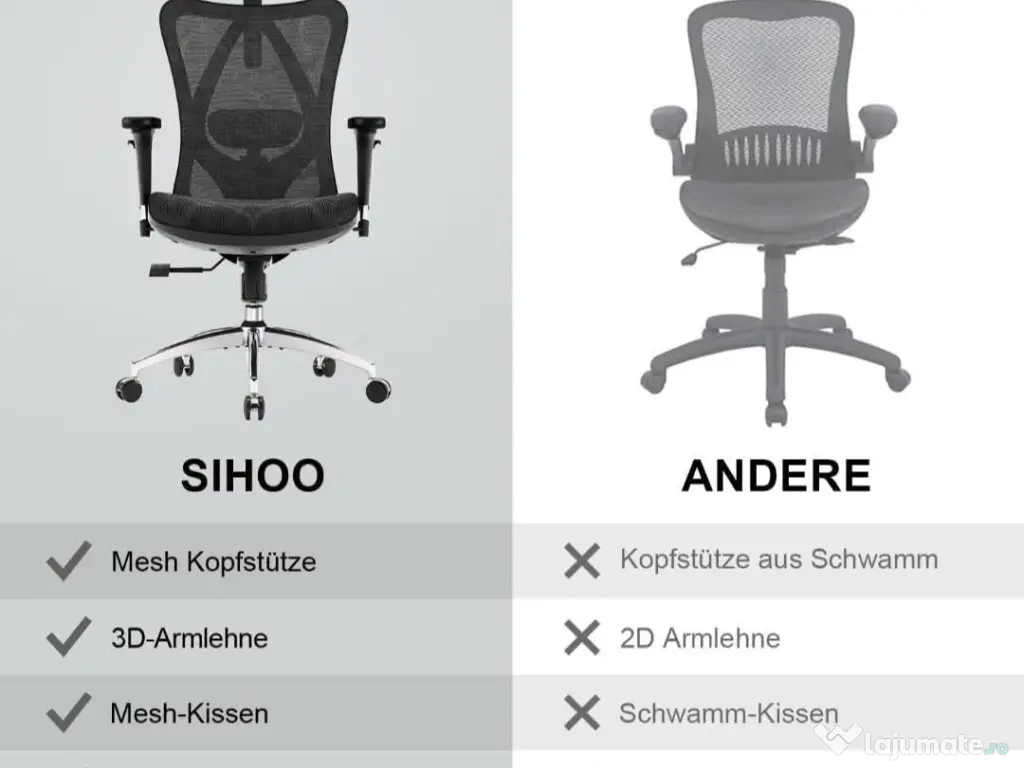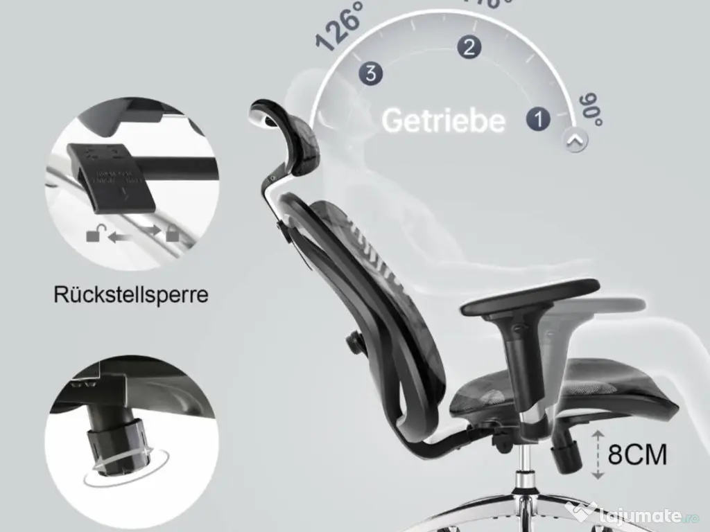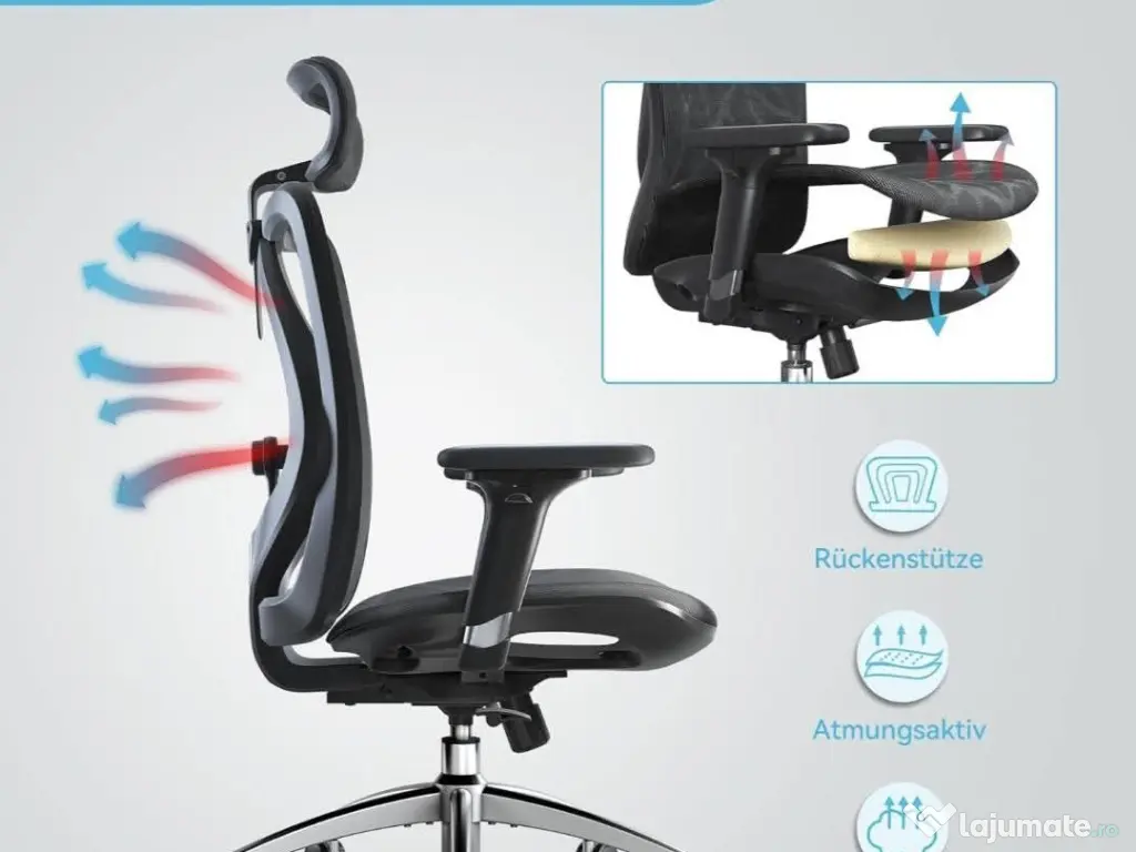 Vând scaun ergonomic de birou SIHOO, scaun rotativ cu suport lombar, tetieră și cotiere reglabile, reglare pe înălțime și funcție de balansare, prietenos cu spatele, capacitate de încărcare: până la 150 kg