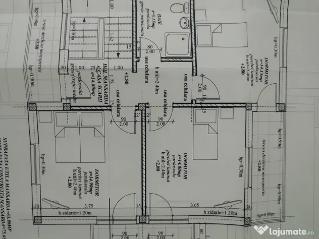 - la mansardă sunt trei dormitoare, o baie, un hol și trei balcoane.