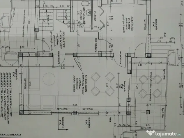 - la parter se regăsesc livingul cu zona de dining, bucătăria, o baie și un hol;