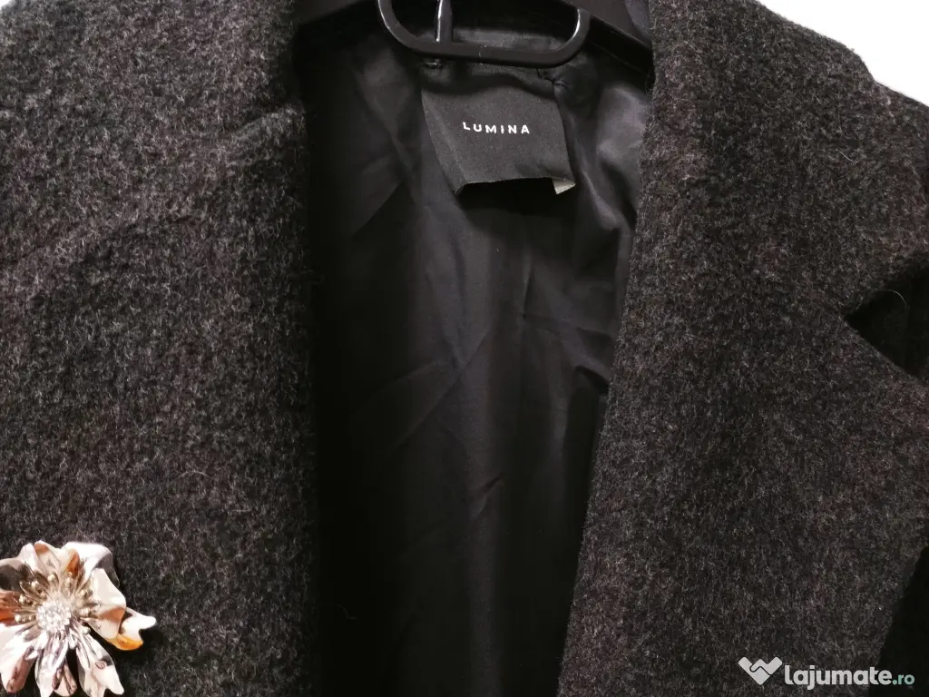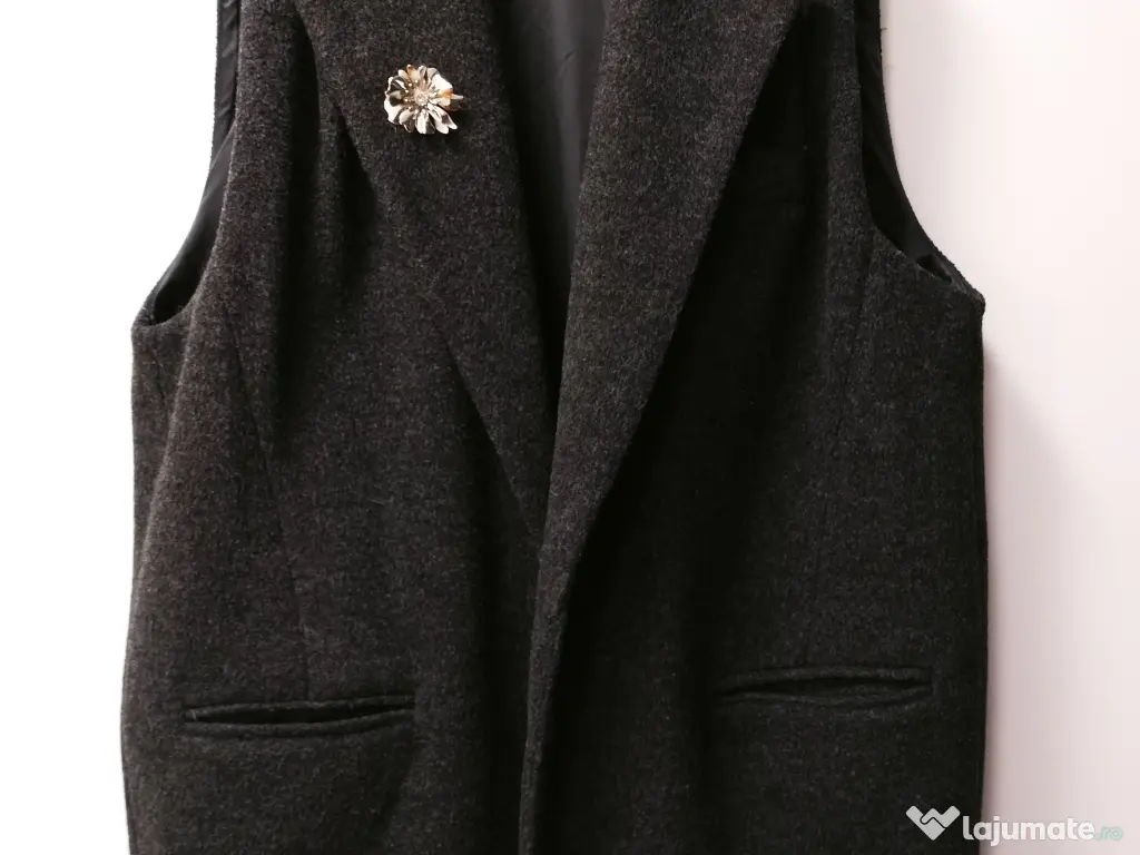 Vesta, model foarte actual, gri închis, cu căptușeală, cu broșe detașabile, care i dau un aspect modern. Este mărimea L, se pretează și pt persoane cu bust mai mare (max 100). Costul ei a fost de 400 ron. A fost îmbrăcată de puține ori, in toamna trecută.