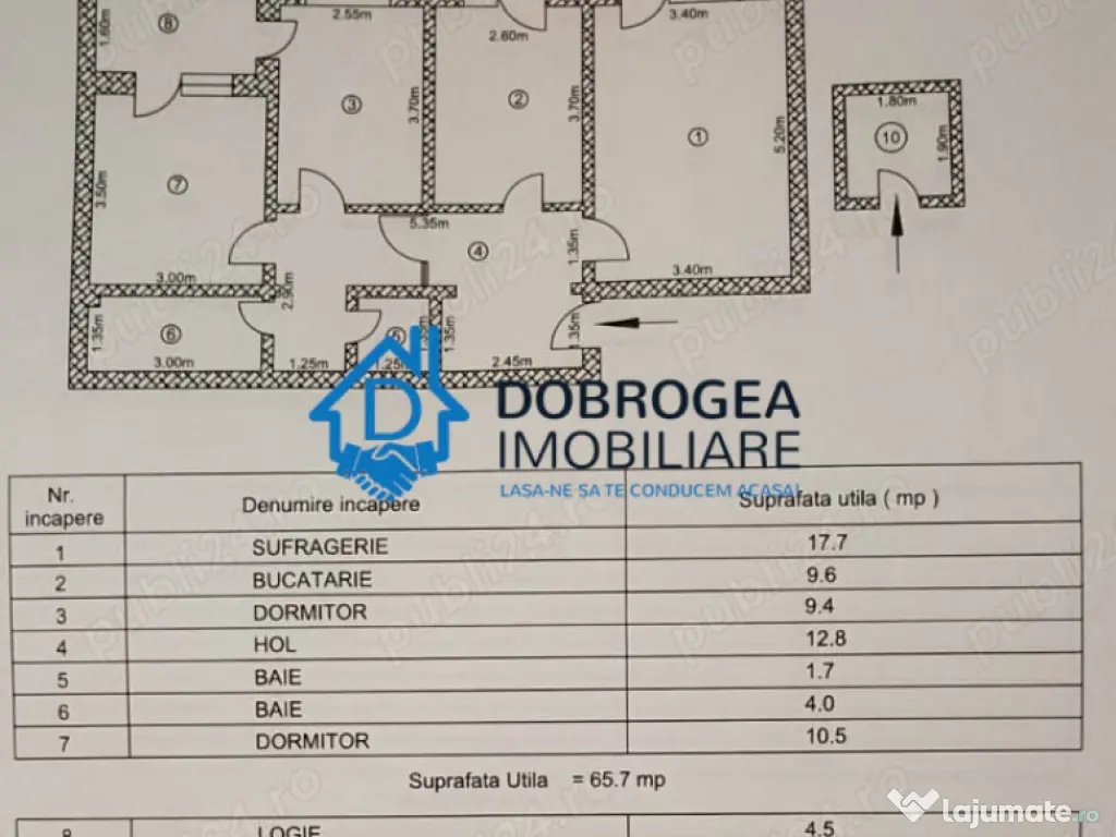 Dobrogea Imobiliare va prezinta spre vanzare un apartament cu 3 camere, decomandat situat in zona CENTRALA,etaj 4 Compus din living,2 dormitoare ,bucatarie, 2 bai, balcon, loja cu o suprafata utila totala de 65.7 mp. Impreuna cu apartamentul se ofera si boxa de 3.4 mp. Blocul este construit in 2001. Apartamentul beneficiaza de centrala termica proprie, aparat de aer conditionat si un balcon mare de 7.1 mp. Se vinde partial MOBILAT si partial UTILAT Va așteptam la vizionare! Ne puteți vizita la sediul nostru situat pe str. Pacii, nr. 6 (la parterul hotelului Select) pentru consultanta gratuita Pentru mai multe oferte vizitați site-ul www.Dobrogea-Imobiliare.ro sau pagina https://www.facebook.com/agentia.dobrogea.9 Id intern: P1961 Confort: 1 Tip imobil: Bloc de apartamente Număr Băi: 2 Comision cumpărător: 2%