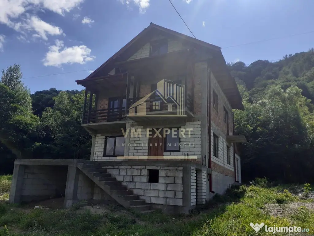 Agentia VM EXPERT IMOBILIARE MUSCEL ofera spre vanzare vila 8 camere S+P+E+M in suprafata de 300 mp, 1 bucatarie, 2 bai, garaj, beci camera centrala, curent electric trifazic, ferestre termopan, in stadiul de constructie, anul 2008. Teren 5000 mp intravilan.