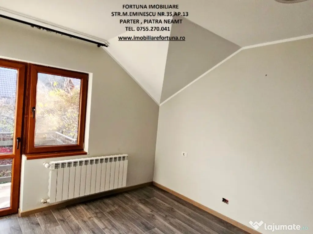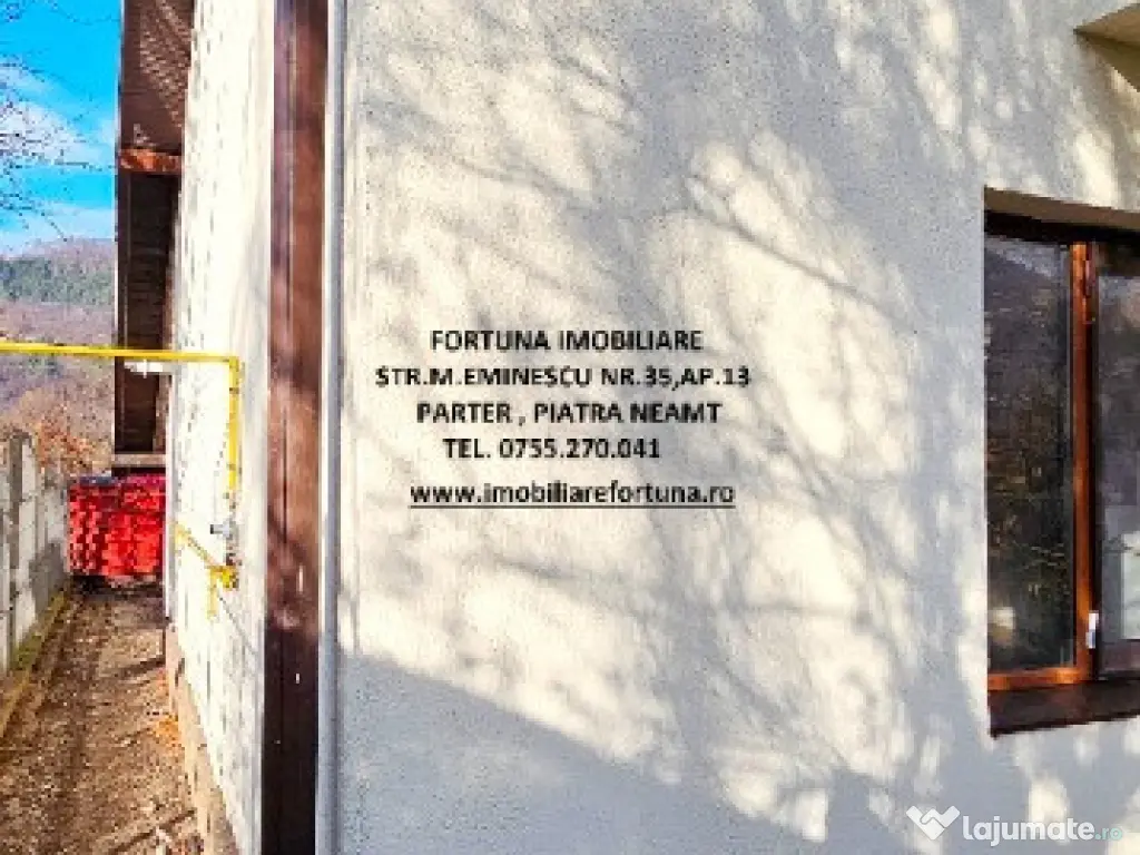 Pentru cei care doresc să se bucure de frumusețea unui cadru natural de poveste, beneficiind de liniște, verde și aer curat, FORTUNA IMOBILIARE propune spre achiziție această proprietate, compusă din casa P+M și 500 mp teren, situată într-o zonă liniștită, cu un view atractiv, la 12 km de Municipiul Piatra Neamț spre Bicaz.