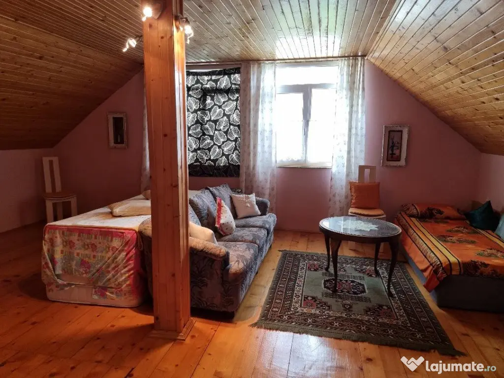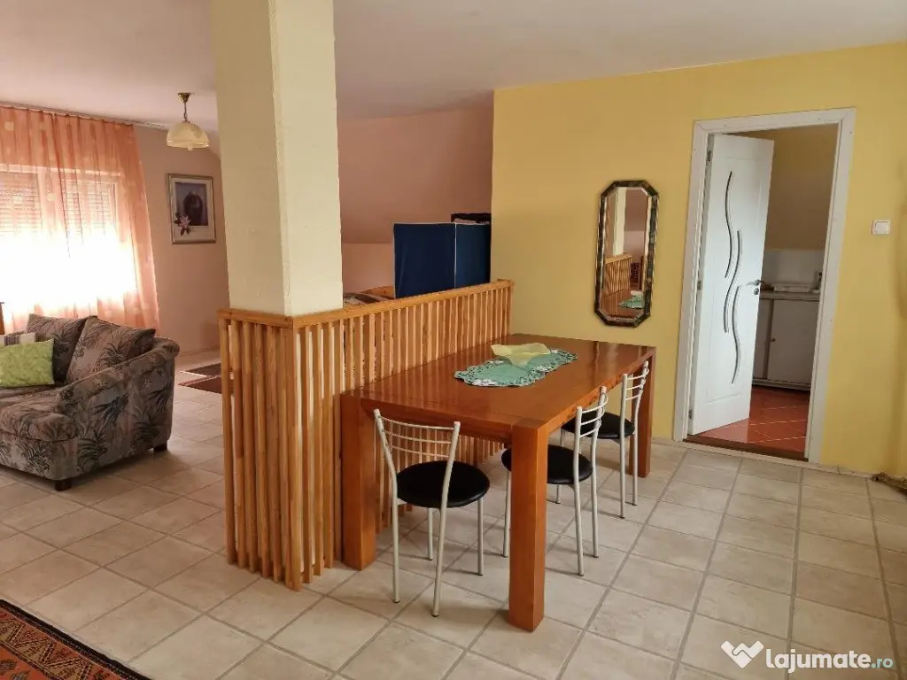 Vand vila in Baile 1Mai , langa Felix , amplasata in zona centrala la sosea , compusa din 2 cladiri individuale , una constructie 2012 , SC total 300 mp , garaj pentru 3 masini , camere mari open-space bucatarie in fiecare corp , intrari separate , contructie din caramida cu izolatie de 8 , incalzire cu semineu si lemne , 3 bai plus una in curte , filigorie, utilitati , intrare auto , gaz in derulare , complet mobilata , dotata ,foarte buna pentru pensiune , sau regim hotelier , grill in curte , imediat ocupabila .Pret 229.000 Euro , neg