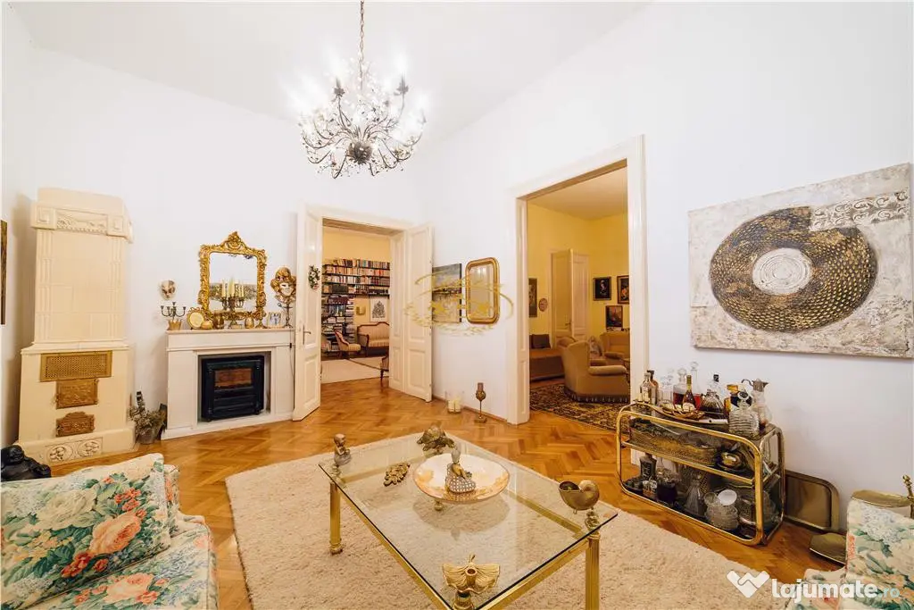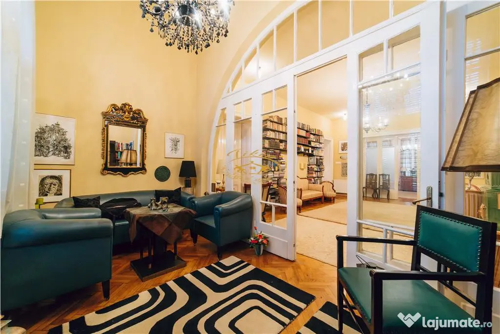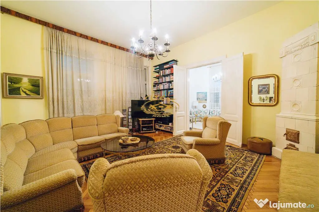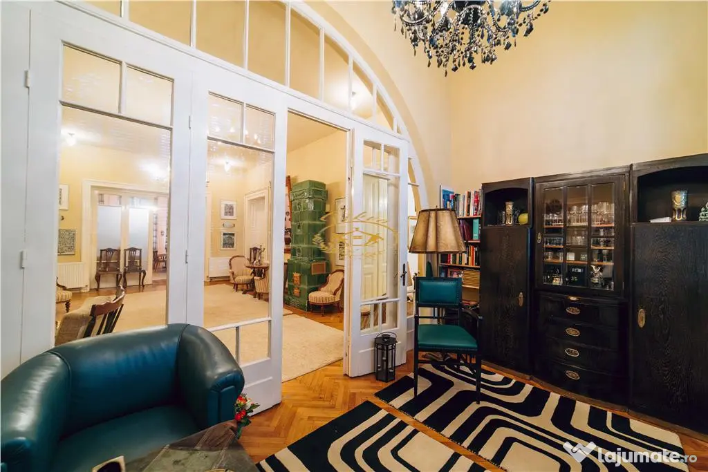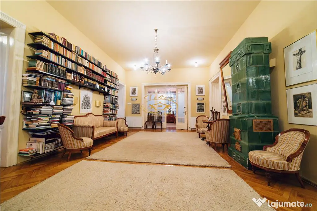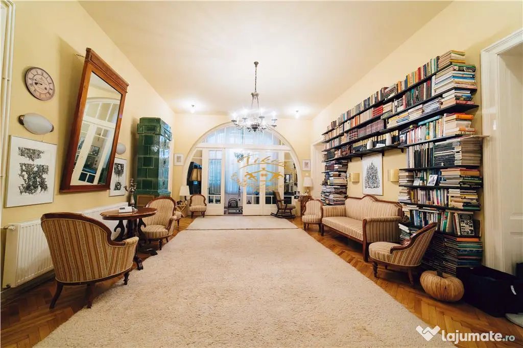 bull; la parter antreu cu mobilier din 1933, restaurat (suprafata utila: 12,9 msup2;); hol/salon de primire oaspeti cu biblioteca, mobilier de salon Biedermeier din anii 1800, restaurat, soba de teracota originala din 1908, oglinda din anii 1800, scaune din 1890, covoare de lana si candelabru (suprafata utila: 30,4 msup2;); camera de zi cu mobilier in stil englezesc cu motive de trandafir, soba de teracota originala din 1908 (suprafata utila: 23,9 msup2;); camera TV cu oglinda venetiana, soba de teracota originala din 1908, doua tapiserii gobeline (suprafata utila: 29,2 msup2;); camera cu mobilier in stil bavarez, cu colt de luat masa (suprafata utila: 25,5 msup2;); dormitor cu soba de teracota originala din 1908 (suprafata utila: 23,4 msup2;); sala de mese cu mobilier din nuc din 1933 (suprafata utila: 18,8 msup2;); baie spatioasa (12,5 msup2;), bucatarie mobilata si utilata, camara, coridor, WC-uri;