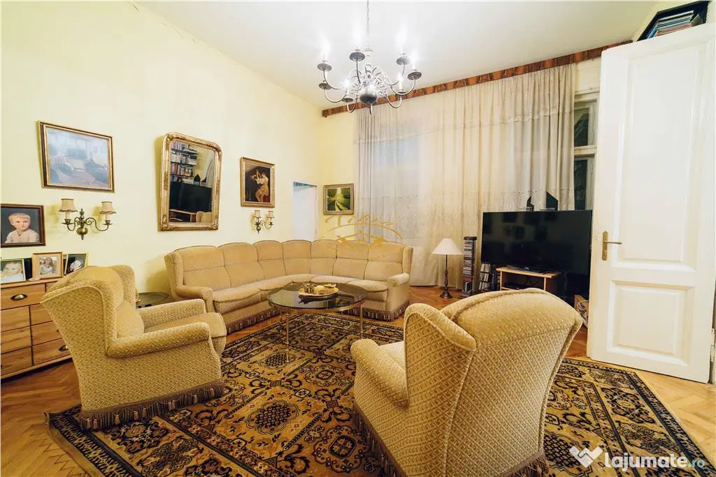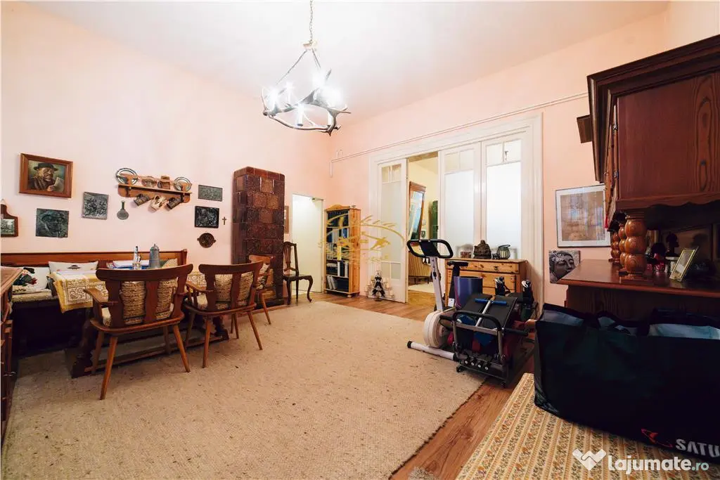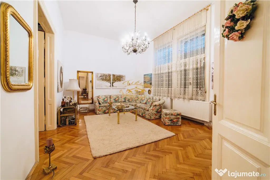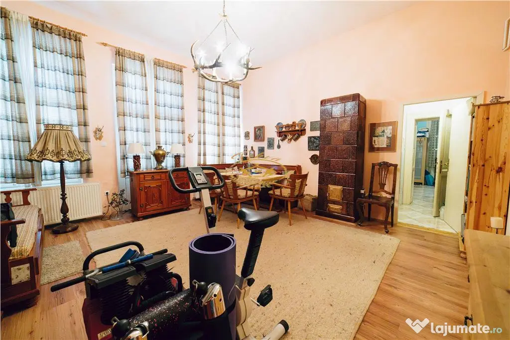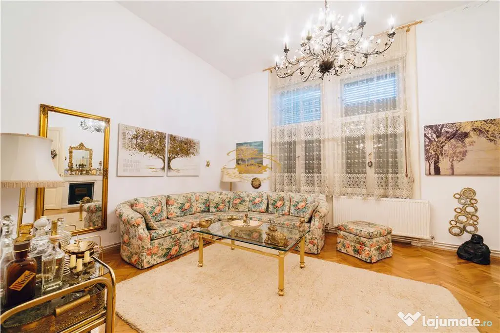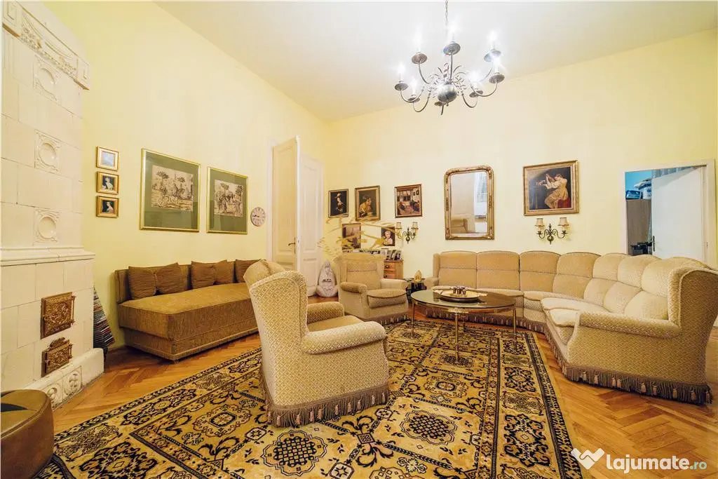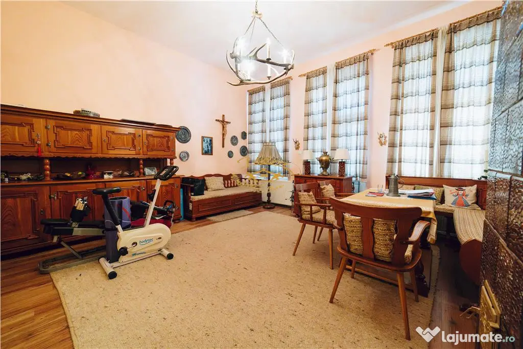 bull; la parter antreu cu mobilier din 1933, restaurat (suprafata utila: 12,9 msup2;); hol/salon de primire oaspeti cu biblioteca, mobilier de salon Biedermeier din anii 1800, restaurat, soba de teracota originala din 1908, oglinda din anii 1800, scaune din 1890, covoare de lana si candelabru (suprafata utila: 30,4 msup2;); camera de zi cu mobilier in stil englezesc cu motive de trandafir, soba de teracota originala din 1908 (suprafata utila: 23,9 msup2;); camera TV cu oglinda venetiana, soba de teracota originala din 1908, doua tapiserii gobeline (suprafata utila: 29,2 msup2;); camera cu mobilier in stil bavarez, cu colt de luat masa (suprafata utila: 25,5 msup2;); dormitor cu soba de teracota originala din 1908 (suprafata utila: 23,4 msup2;); sala de mese cu mobilier din nuc din 1933 (suprafata utila: 18,8 msup2;); baie spatioasa (12,5 msup2;), bucatarie mobilata si utilata, camara, coridor, WC-uri;