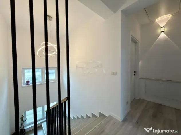 Etaj: 3 dormitoare, hol, dressing, 2 bai si casa scarii;