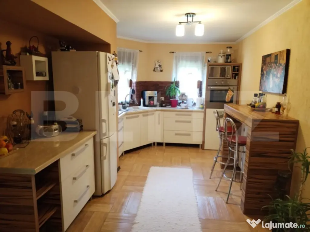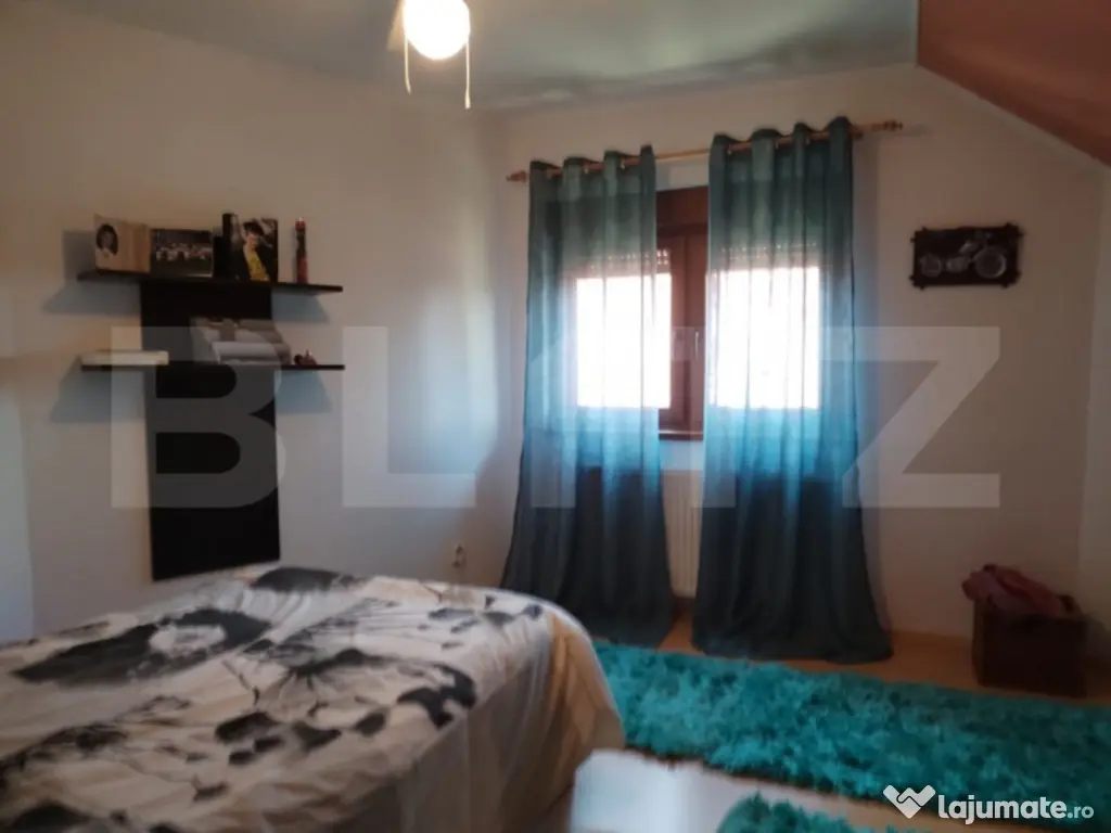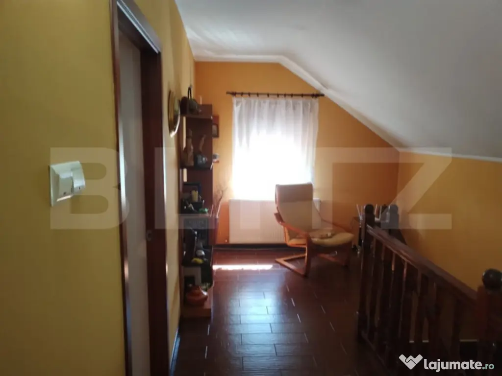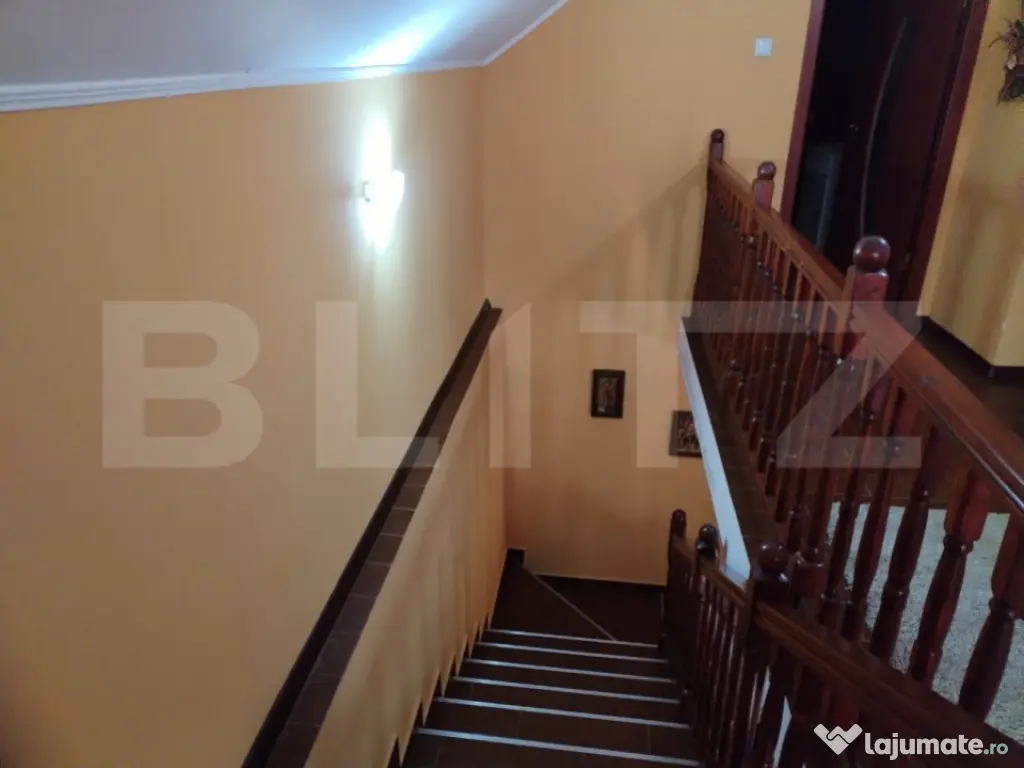Blitz Satu Mare va propune spre achizitionare o proprietate impresionanta, finalizata in 2015. Este situata intr-o zona linistita si aerisita. Aceasta casa confera un echilibru ideal intre confort modern si un mediu natural deosebit. Suprafata totala a terenului este de 1241 mp. Casa are 210 mp utili si este configurata astfel: la parter se regasesc un dormitor, living generos, dressing, bucatarie, baie, camera tehnica(centrala+boiler) cu intrare atat din interior cat si intrare separata din exterior. La etaj sunt doua dormitoare, hol mare, mini sala de fitness, biblioteca generoasa si o baie. Casa este mobilata, utilata si ultrafinisata cu materiale premium de calitate superioara. Este izolata atat pe exterior(5 cm de polistiren), cat si pe interior(vata minerala+placi de rigips pe caramida). Usa de la intrare si geamurile(prevazute cu jaluzele) sunt din termopan. Toate acestea genereaza costuri de intretinere reduse, ceea ce confera o solutie de locuire economica. Are o terasa de 20 mp, cu o priveliste deosebita inspre curte. Pe teren se regasesc inca doua constructii, garajul cu lemnaria(45 mp) si o magazie pentru scule de gradinarit(9 mp). Curtea interioara este o oaza de verdeata, care se continua cu o frumoasa livada de pomi fructiferi. Proprietatea este prevazuta cu senzori de lumina si este imprejmuita de un gard(270 metri liniari) din beton. Aceasta casa este ideala pentru cei care apreciaza linistea, spatiul generos si peisajele deosebite. Contactati-ne pentru detalii suplimentare si vizionare! Cod ofertă / ID BLITZ: P145535 Id intern: P145535 Număr niveluri imobil: 1 Număr Băi: 2 Curent Apă Canalizare Gaz