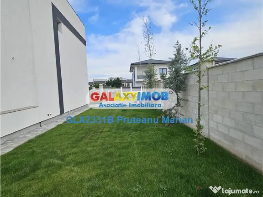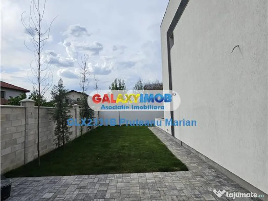 Gradina mirifica , amenajata cu gazon de tip rulou, poarta automatizata la intrare in vila moderna ,fiind foarte aerisita in vecinatate cu oaza de verdeata, avand strada de peste 9 m latime cu case individuale in vecinatate.