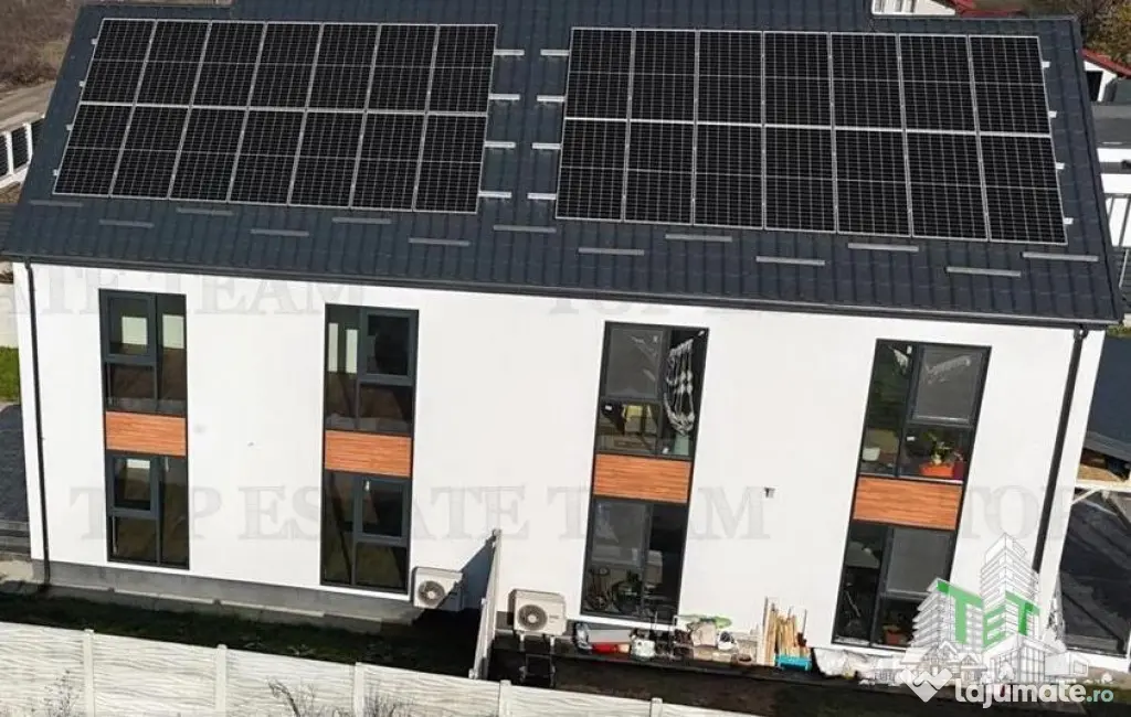 Utilitati si dotari: apa retea publica, canalizare, curent trifazic 380V, gaze la poarta, sistem de alarma, panouri fotovoltaice, boiler apa, pompa de caldura HITACHI cu invertor (face si rece pe timp de vara)