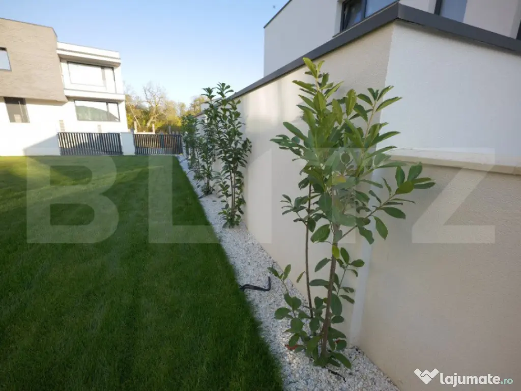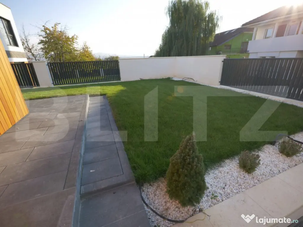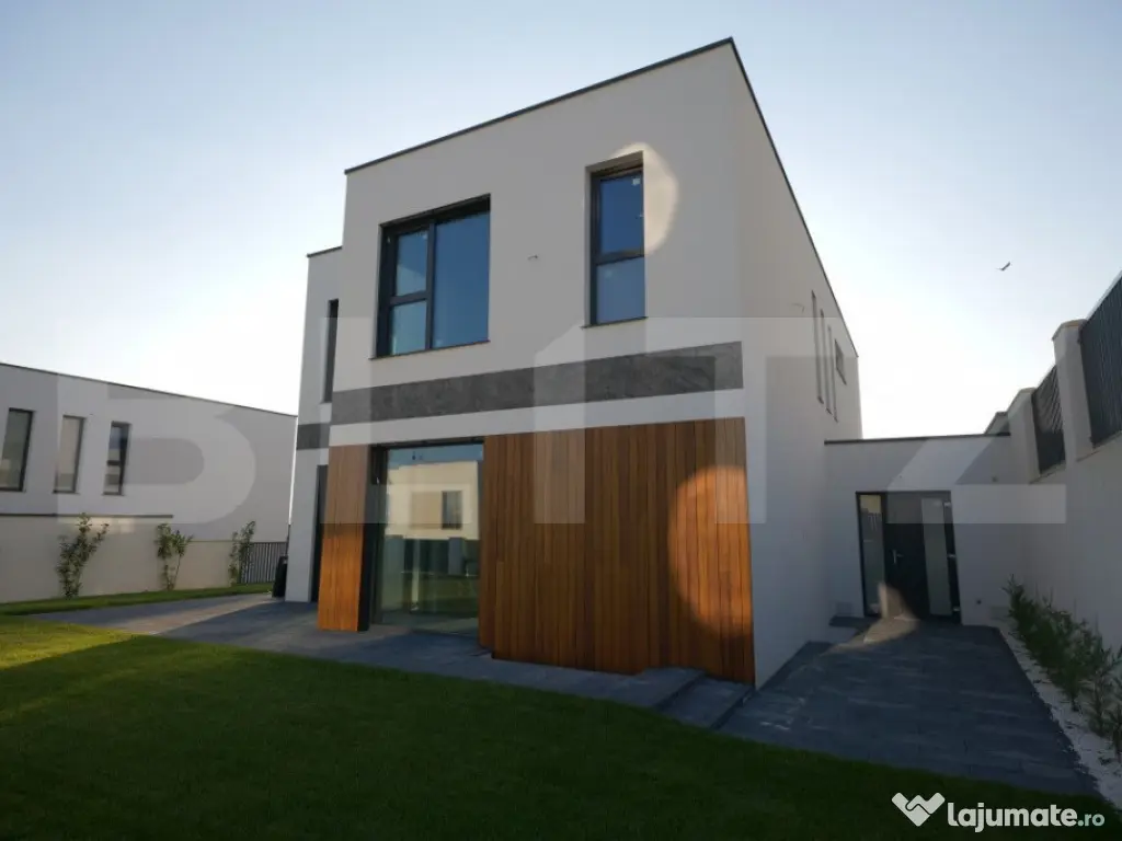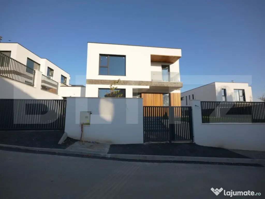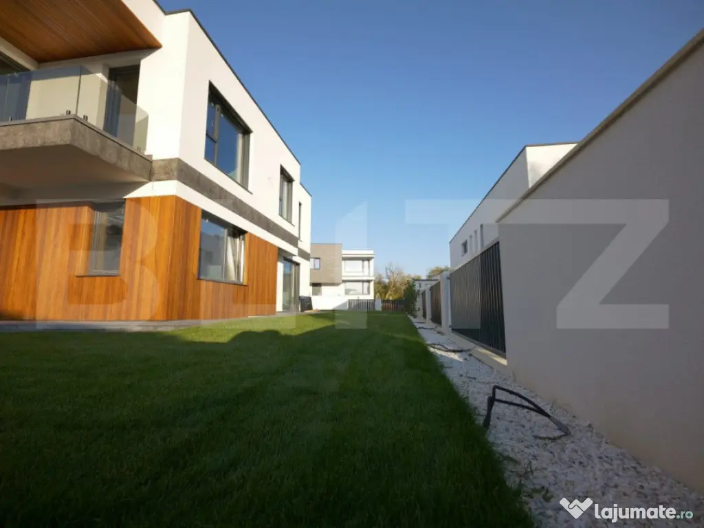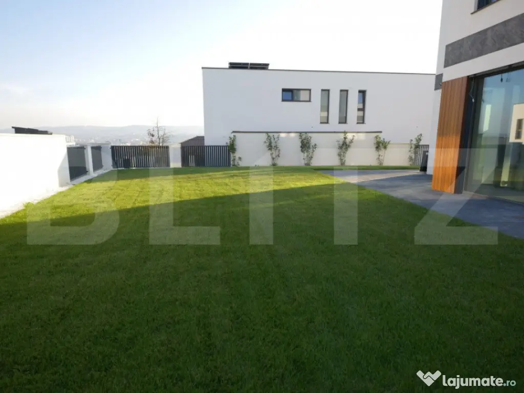 Vila Smart Home de vânzare oferită de BLITZ are o suprafață construită 437,54 mp și o suprafața utilă de 323 mp utili, pe un teren de 540 mp, amplasată în complexul exclusivist de 4 vile Bellevue. Casa a fost finalizată în 2024, cu regim S+P+E, și include un living spațios, birou, bucătărie deschisă cu dining, playroom și Home Cinema la subsol, 4 dormitoare, 4 băi, 2 dressinguri, o saună uscată, spațiu tehnic, depozitări, balcon, bibliotecă la etaj și un garaj. Localizare Situată pe strada Doinei din cartierul Dâmbul Rotund, vila se află pe o stradă asfaltată, cu acces facil către centrul orașului (5-10 minute cu mașina). În apropiere se găsesc stații de transport public (5 minute de mers pe jos), magazine, școli, grădinițe și licee, fiind ideală pentru familii. Construcție și finisaje Terenul, inițial în pantă, a fost terasat pentru a crea o curte plană, folosind ziduri de sprijin tip L pentru stabilitate. Fundația este protejată cu hidroizolații din membrane bituminoase și drenuri din piatră și tuburi. Zidurile sunt construite din cărămidă Porotherm Robust pentru izolație termică superioară și durabilitate. Interiorul casei este finisat cu glet pe bază de ipsos în 3 straturi, iar podeaua e pregătită pentru parchet. Compartimentarea casei Compartimentare detaliată: Subsolul (109,59 mp) cuprinde o încăpere hobby de 52,9 mp, baie, spațiu tehnic, cameră pentru oaspeți și saună uscată. Parterul (98,7 mp) include bucătăria, diningul, livingul de 35,1 mp, birou, baie, terasă și garaj. La etaj (95,58 mp) sunt un hol, bibliotecă, dormitor matrimonial cu baie și dressing, două dormitoare suplimentare, baie și balcon. Dotările casei Casa are instalație de curent trifazic. Sunt asigurate și montate toate utilitățile - gaz, curent trifazic, apă, canal, internet. Smart Home: Casa beneficiază de cablaje pentru controlul automatizat pentru: perdele, draperii, jaluzele, iluminat de bază, Internet, sistem audio, senzori de prezență, dioxid de carbon, temperatură și umiditate, supraveghere video, videointerfon, stație de încărcare a mașinii electrice, etc. Ferestrele au certificat de ”Casă Pasivă” și sunt din gama Rehau Geneo. Ușa de la intrare este metalică, în stil modern, cu un design deosebit. Pe acoperișul casei sunt montate 2 panouri pentru încălzirea apei. Încălzirea casei este asigurată de un sistem de încălzire prin pardoseală. Curtea este amenajată integral, cu gazon dotat cu sistem automat de irigare, garduri decorative din fier și tencuială. Porțile sunt automate, iar căile de acces exterioare și trotuarele sunt pavate cu gresie antiderapantă. Prețul nu include TVA. Se acceptă și clienți cu credit ipotecar. Negociabil pentru clienții care vor să achite plata majoritar din surse proprii. Pentru mai multe detalii sau pentru a programa o vizionare completează formularul de contact/sună-ne la numărul de telefon afisat sau intra pe smart-bellevue-villas.ro. Cod ofertă / ID BLITZ: P135376 Id intern: P135376 Număr niveluri imobil: 1 Număr Băi: 4 Nr. locuri parcare: 2 Curent Apă Canalizare Gaz
