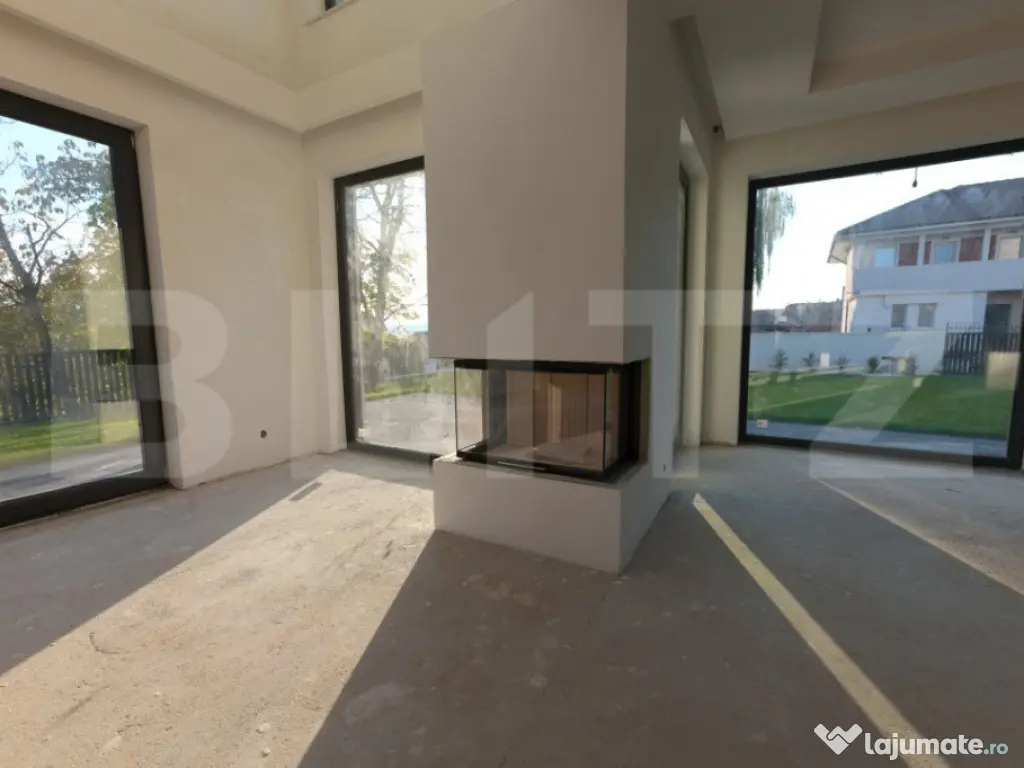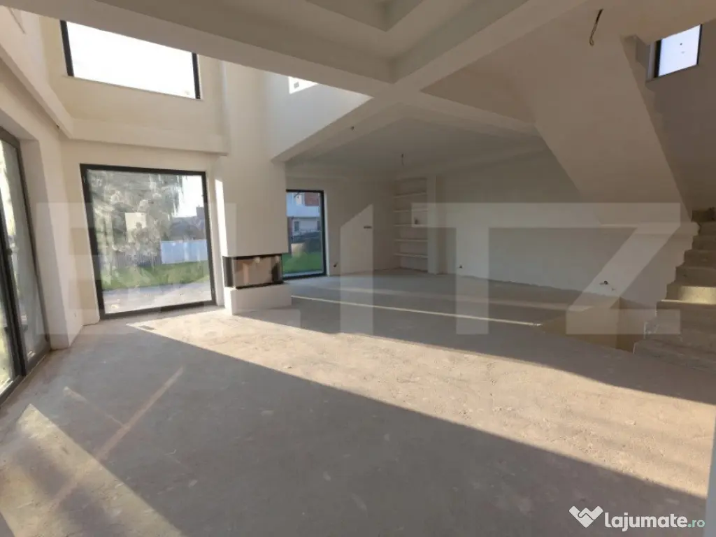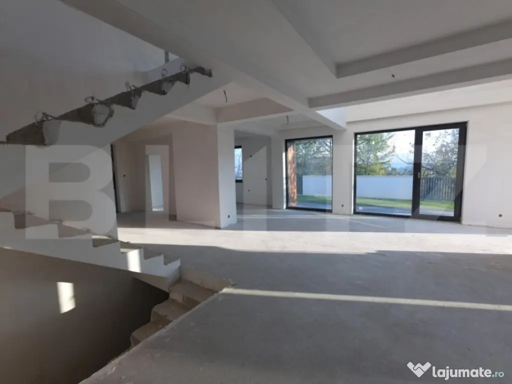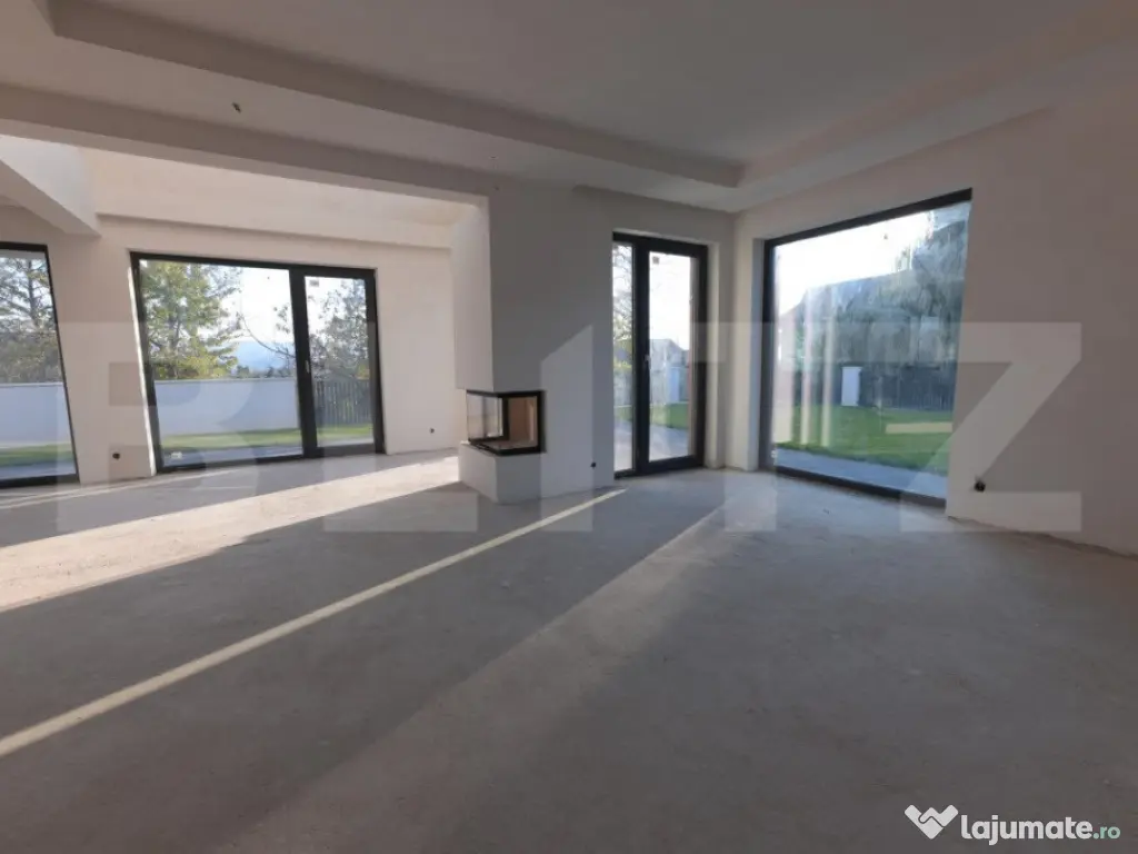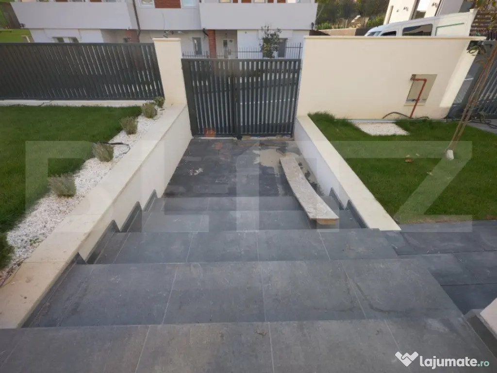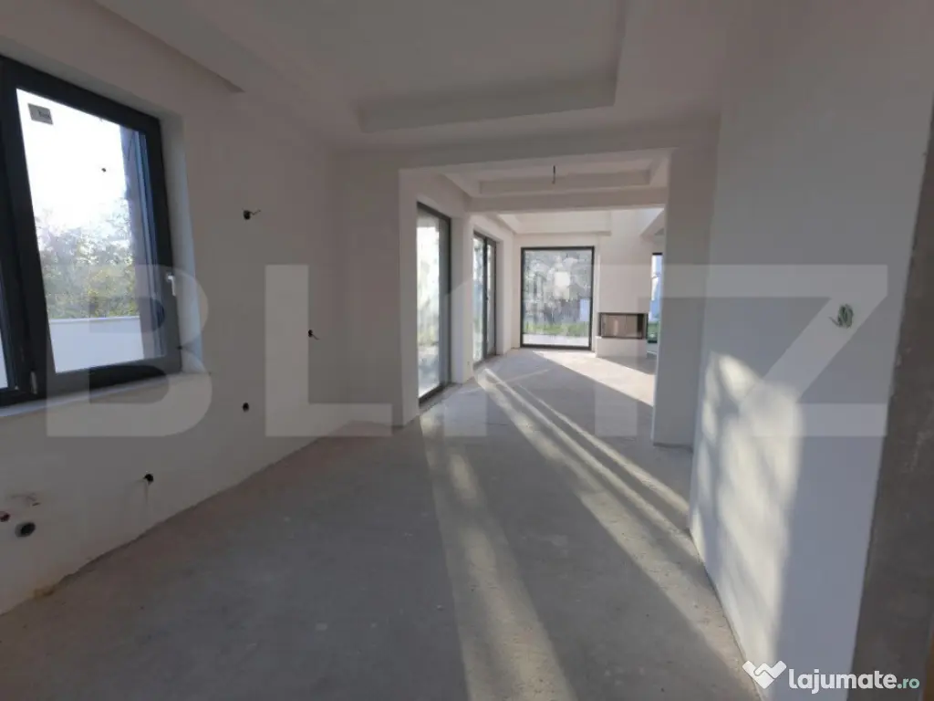 Vila Smart Home de vânzare oferită de BLITZ are o suprafață construită 437,54 mp și o suprafața utilă de 323 mp utili, pe un teren de 540 mp, amplasată în complexul exclusivist de 4 vile Bellevue. Casa a fost finalizată în 2024, cu regim S+P+E, și include un living spațios, birou, bucătărie deschisă cu dining, playroom și Home Cinema la subsol, 4 dormitoare, 4 băi, 2 dressinguri, o saună uscată, spațiu tehnic, depozitări, balcon, bibliotecă la etaj și un garaj. Localizare Situată pe strada Doinei din cartierul Dâmbul Rotund, vila se află pe o stradă asfaltată, cu acces facil către centrul orașului (5-10 minute cu mașina). În apropiere se găsesc stații de transport public (5 minute de mers pe jos), magazine, școli, grădinițe și licee, fiind ideală pentru familii. Construcție și finisaje Terenul, inițial în pantă, a fost terasat pentru a crea o curte plană, folosind ziduri de sprijin tip L pentru stabilitate. Fundația este protejată cu hidroizolații din membrane bituminoase și drenuri din piatră și tuburi. Zidurile sunt construite din cărămidă Porotherm Robust pentru izolație termică superioară și durabilitate. Interiorul casei este finisat cu glet pe bază de ipsos în 3 straturi, iar podeaua e pregătită pentru parchet. Compartimentarea casei Compartimentare detaliată: Subsolul (109,59 mp) cuprinde o încăpere hobby de 52,9 mp, baie, spațiu tehnic, cameră pentru oaspeți și saună uscată. Parterul (98,7 mp) include bucătăria, diningul, livingul de 35,1 mp, birou, baie, terasă și garaj. La etaj (95,58 mp) sunt un hol, bibliotecă, dormitor matrimonial cu baie și dressing, două dormitoare suplimentare, baie și balcon. Dotările casei Casa are instalație de curent trifazic. Sunt asigurate și montate toate utilitățile - gaz, curent trifazic, apă, canal, internet. Smart Home: Casa beneficiază de cablaje pentru controlul automatizat pentru: perdele, draperii, jaluzele, iluminat de bază, Internet, sistem audio, senzori de prezență, dioxid de carbon, temperatură și umiditate, supraveghere video, videointerfon, stație de încărcare a mașinii electrice, etc. Ferestrele au certificat de ”Casă Pasivă” și sunt din gama Rehau Geneo. Ușa de la intrare este metalică, în stil modern, cu un design deosebit. Pe acoperișul casei sunt montate 2 panouri pentru încălzirea apei. Încălzirea casei este asigurată de un sistem de încălzire prin pardoseală. Curtea este amenajată integral, cu gazon dotat cu sistem automat de irigare, garduri decorative din fier și tencuială. Porțile sunt automate, iar căile de acces exterioare și trotuarele sunt pavate cu gresie antiderapantă. Prețul nu include TVA. Se acceptă și clienți cu credit ipotecar. Negociabil pentru clienții care vor să achite plata majoritar din surse proprii. Pentru mai multe detalii sau pentru a programa o vizionare completează formularul de contact/sună-ne la numărul de telefon afisat sau intra pe smart-bellevue-villas.ro. Cod ofertă / ID BLITZ: P135376 Id intern: P135376 Număr niveluri imobil: 1 Număr Băi: 4 Nr. locuri parcare: 2 Curent Apă Canalizare Gaz