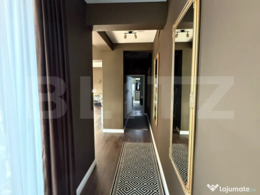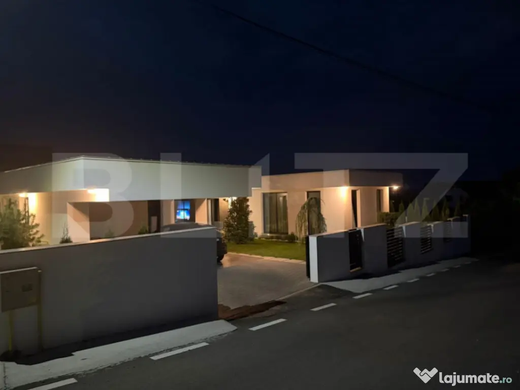 Blitz va ofera spre vânzare o reședință modernă situată în vecinătatea Clinicii Hereditas, într-o zonă retrasă și liniștită, ce oferă confort, intimitate și acces rapid către oraș. Casa impresionează prin stilul arhitectural contemporan și prin atenția acordată fiecărui detaliu, amenajarea acesteia fiind coordonată de un designer de interior. Cum intram in casa, gasim un living generos, inundat de lumină naturală, unde tonurile calde și texturile fine creează o atmosferă de relaxare și rafinament. Bucătăria este integrată într-un spațiu open-space, complet echipată și mobilată, având insulă centrală și acces direct către terasa exterioară – un loc ideal pentru seri liniștite sau momente petrecute alături de cei dragi. Mai apoi, avem trei dormitoare spațioase, doua dressinguri si trei bai. Dormitorul matrimonial detine atat baie proprie cat si un dressing spatios. Fiecare cameră este gândită ca un spațiu distinct, cu personalitate, unde finisajele premium, tapetul decorativ și mobilierul ales cu grijă se completează armonios. Mai avem si camera centralei si o camara, avand mai mult spatiu pentru depozitare. Cu o suprafață construită de 282 mp și 220 mp utili, locuința este organizată pentru a răspunde atât nevoilor unei familii, cât și dorinței de spațiu și eleganță. Întreaga locuință este dotată cu încălzire în pardoseală, tâmplărie din aluminiu cu suprafețe vitrate ample cu sticla securizata, geamurile avand o dimensiune de 280 cm și sistem de ventilație cu recuperare, oferind un climat interior plăcut în orice perioadă a anului. Casa are acoperis ascuns, care are o termoizolatie echivalenta vatei bazaltice de 40 grosime si hidroizolatie EPDM membrana. Intreaga casa a fost construita cu caramida phoroterm 25, fier beton 17000 kg, tencuiala interior/exterior. Exteriorul completează eleganța casei: teren de 720 mp amenajat cu zonă verde, regasim si un loc acoperit pentru două mașini și o terasă exterioară generoasă, ideală pentru relaxare. Curtea fiind amenajata cu arbusti ornamentali, gazon rulou si sistem de irigatii cu senzori de ploaie. Accesul se face pe drum asfaltat. Proprietatea se vinde complet mobilată și utilată, în aceeași configurație prezentată. Cod ofertă / ID BLITZ: P156438 Id intern: P156438 Număr Băi: 3 Nr. locuri parcare: 2 Curent Apă Canalizare Gaz Climă