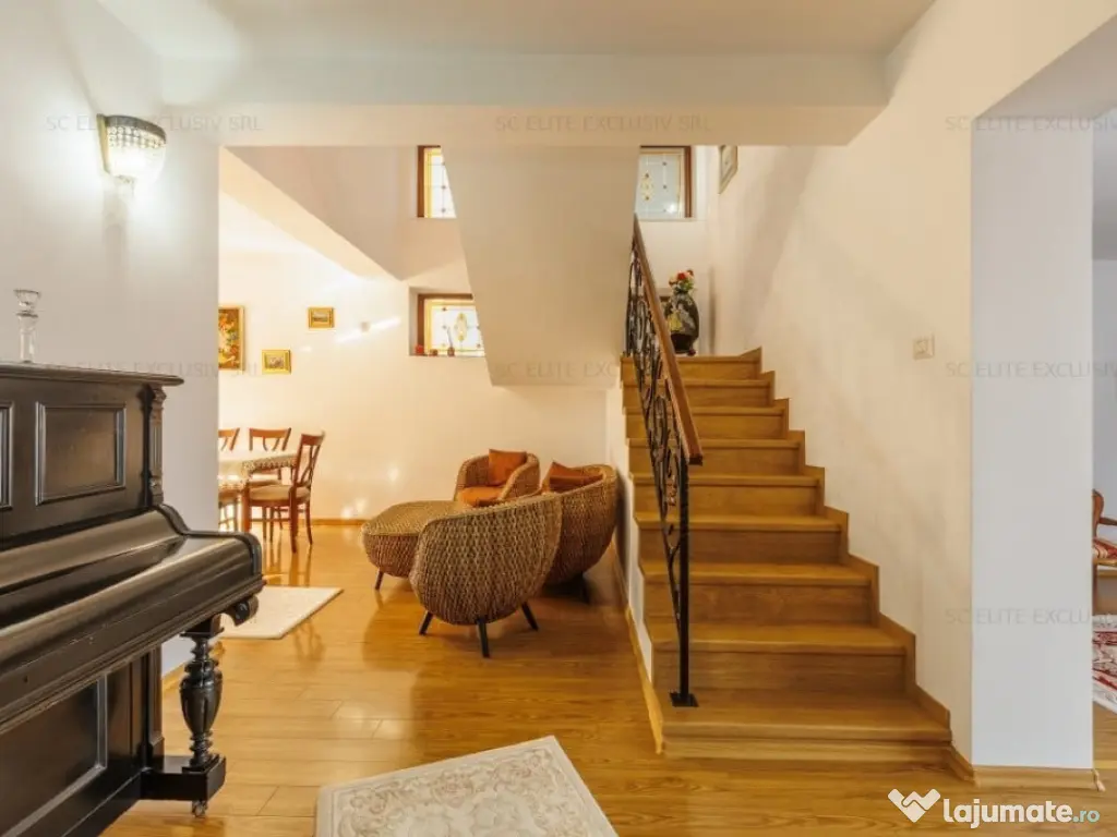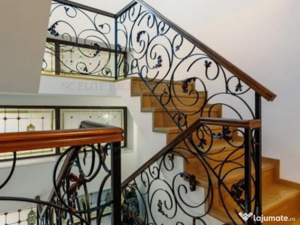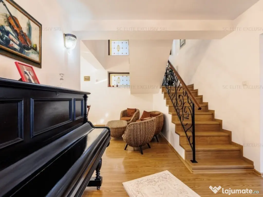 Etaj : Hol 21 m2, dormitor matrimonial 21 m2 cu ieșire pe terasă acoperită de 16 m2, dormitor 16 m2 cu ieșire pe terasă de 9 m2, dormitor(în prezent utilizat camera hobby, home cinema) 16m2, baie cu jacuzzi 8 m2, dressing 11 m2 cu ieșire pe terasă de 12 m2.
