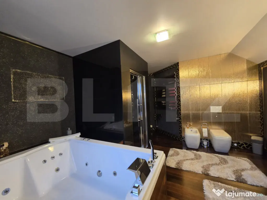 Vilă cu piscina spectaculoasă de vânzare în zona Grand Hotel Italia O proprietate cu adevărat unică, ce îmbină eleganța designului arhitectural cu rafinamentul detaliilor interioare și pozitionarea eficienta a locatiei. Situată într-una dintre cele mai cautate zone ale Clujului – la limita cartierului Andrei Muresanu cu Buna Ziua , această vilă îți oferă confort, și o atmosferă aparte. Detalii tehnice: Teren: 1242 mp Front 34 ml Suprafață construită: 620 mp Suprafață utilă totală: 423 mp Regim de înălțime: D+P+E+M Proprietatea este din anul 2004 si renovata in 2013. 2 locuri de parcare - garaj pentru două mașini. De la renovare a fost locuita doar cate 3 saptamani pe an. Exterior : Grădină terasata in 2 trepte , in partea de jos este piscina pe un teren de aproximativ 1000 mp , iar in partea de sus este o livada cu pomi fructiferi ( 242 mp ) Spatiu pentru crama si loc pentru depozitare sunt incastrare in partea de jos a terenului cu livada . O curte spatioasa care ofera casei eleganta si spatiu de desfasurare pentru viitori proprietari. Compartimentare interioară: Demisol : este precum parterul unei case , de la intrare ne intampina zona de lobby, bucataria - care nu a fost utilizata niciodata , zona de luat masa baie si spații tehnice, spălătorie/uscătorie, depozitare. Parter : hol cu priveliste panoramica asupra orasului, un living spatios cu deschidere in zona de bucatarie, baia si doua dormitoare. Etaj: dormitor matrimonial cu dressing, baia matrimoniala cu jacuzzi este lucrata la cel mai inalt nivel de lux cu foita si praf de aur pe pereti si piele de iguana pe dulapul de la chiuveta , încă un dormitor, plus o baie mare. Mansarda : un spatiu open space , o baie de servici - un loc potrivit pentru cinema, spatiu de joaca pentru copii , sau loc de petrecut timpul de calitate cu diverse activitati in familie. Dotări și finisaje : Încălzire prin calorifere Semineu. Finisaje naturale: parchet masiv din stejar, piatră naturală, detalii din lemn, piele si aur. Acoperiș din tigla . Crama . Piscina exterioara. Această vilă, foarte util compartimentata poate gazdui chiar doua familii, ori o bona sau bunicii. Este o proprietate unică pe piață, perfectă pentru cei care își doresc un stil de viață exclusivist, aproape de punctele de interes din oras , dar cu toate avantajele și confortul unei locuințe moderne. Imobilul este în prezent nelocuit, vizionările se pot organiza la cerere, prin stabilirea prealabilă a unei programări. Cod ofertă / ID BLITZ: P155334 Id intern: P155334 Număr niveluri imobil: 2 Număr Băi: 5 Nr. locuri parcare: 2 Curent Apă Canalizare Gaz Climă