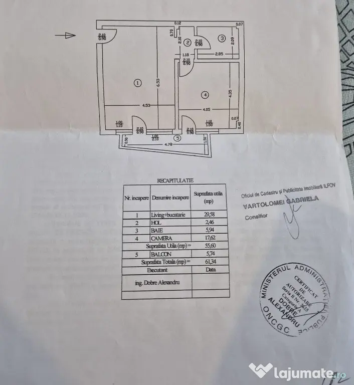 Apartamentul este situat la etajul 2/P+5+M si are o suprafață utila totală de 61,34 ( utilă 55,60 + balcon 5,74 ), construcție 2009, complet mobilat si utilat.
