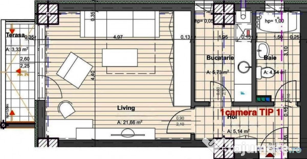 Apartament 2 camere, tip 1, decomandat, suprafata 56.92 mp, compartimentat astfel: