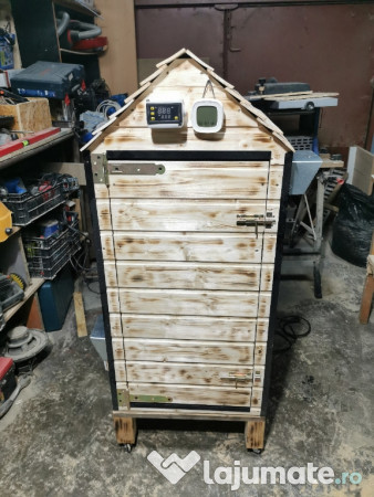 Afumatoare electrica cu convecție, temperatura controlata Afumatoare convecție cu temperatura controlata. Afumatoarea este construita din lemn, cu izolație de vata. La interior este placata cu tabla.