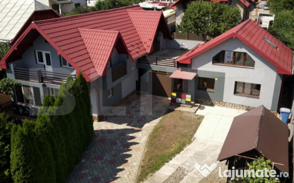 Proprietatea este împrejmuită cu gard din fier forjat și beneficiază de o curte mare, frumos amenajată, ideală pentru relaxare, dar și pentru activități comerciale.