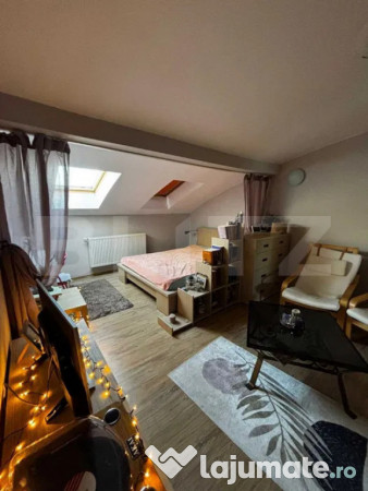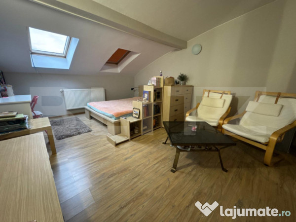 Apartamentul dispune de ferestre de mansardă Velux, care oferă lumină naturală din plin, încălzire cu centrală proprie pentru costuri reduse și se vinde complet mobilat și utilat, exact ca în fotografii. Compartimentarea este eficientă, ceea ce îl face potrivit atât ca locuință personală, cât și ca investiție, zona fiind una cu cerere ridicată pentru închiriere.