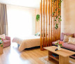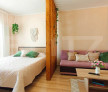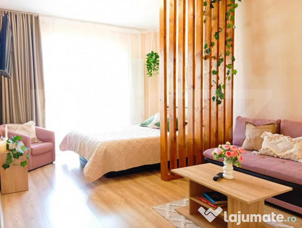 Suprafața utilă este de 42 mp, iar compartimentarea decomandată se prezintă astfel: hol, dormitor cu pat matrimonial, canapea, bucătărie, baie si balcon.