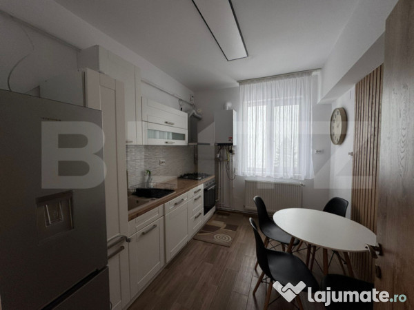 – Bucătărie generoasă, complet mobilată și utilată, dotată cu centrală termică proprie, frigider, aragaz, cuptor și hotă, plus loc de luat masa