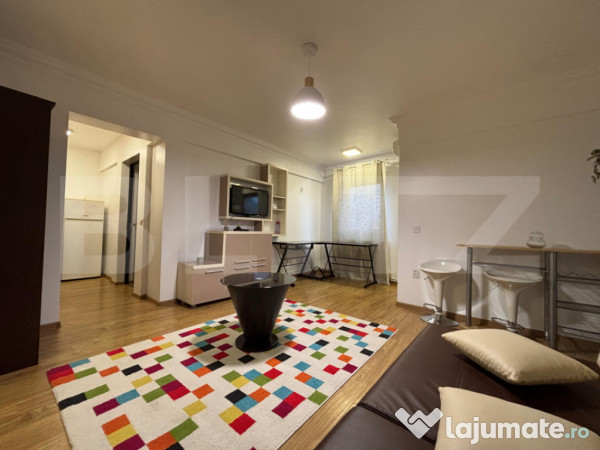 Apartamentul este complet mobilat și utilat, fiind ideal atât pentru locuință proprie, cât și pentru investiție. Compartimentarea este practică și funcțională și cuprinde hol de acces, living luminos, bucătărie, dormitor și baie.