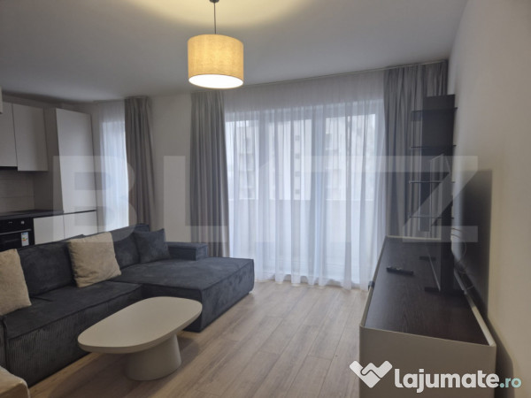 Apartamentul este dotat cu incalzire in pardoseala, mobilat si utilat premium, si este compus din doua camere, hol, baie, bucatarie open space si boxa de depozitare. Locul de parcare se poate achizitiona la pretul de 5000 euro. Apartamentul este gata de mutare si este ideal pentru persoanele care doresc un spatiu comod de locuit in cel mai nou si mai vibrant cartier al orasului.