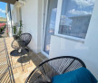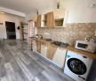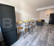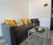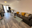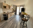 living open space cu bucatarie si loc de dinning, un dormitor, baie si un balcon.