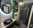 - Baie cu accente naturale, dus tip walk-in si obiecte sanitare negre.
