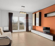 Apartamentul este situat la etajul 1/2 şi este compus din: hol, living spațios cu loc de luat masa, bucǎtǎrie utilatǎ ( cuptor electric, plita pe gaz, hota, mașină de spălat vase ), un dormitor, o baie, curte cu spații verzi şi loc de parcare în curte privatǎ cu pazǎ permanentă .
