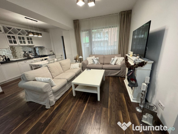 Blitz vă propune spre vanzare un apartament cu 2 camere de lux, situat la parterul unui bloc nou, în zona exclusivistă! Locuința se remarcă printr-un design contemporan, compartimentare practică și finisaje de calitate superioară. Se vinde complet mobilat și utilat, cu dotări premium: centrală termică proprie, mașină de spălat, frigider, plită pe gaz și cuptor electric. Livingul este spațios, aerisit și primitor, cu zonă de relaxare și dining și are acces direct către o terasă mobilata – un spațiu ideal pentru relaxare. Bucătăria, este complet echipată, cu electrocasnice moderne și mobilier cu finisaje elegante. Dormitorul dispune de un pat matrimonial generos . Baia este amenajată cu finisaje premium și cabină de duș cu sticlă securizată. Un apartament ideal pentru un cuplu care își dorește confort, stil și proximitate față de natură. Pentru mai multe detalii, va asteptam cu drag la vizionare!
