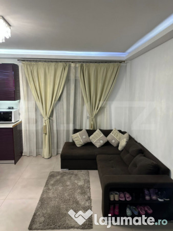 1 dormitor luminos și aerisit, mobilat complet, cu pat matrimonial și dressing