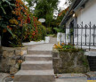 Curtea amenajata cu vegetatie si alei pavate ofera un colt intim de relaxare.