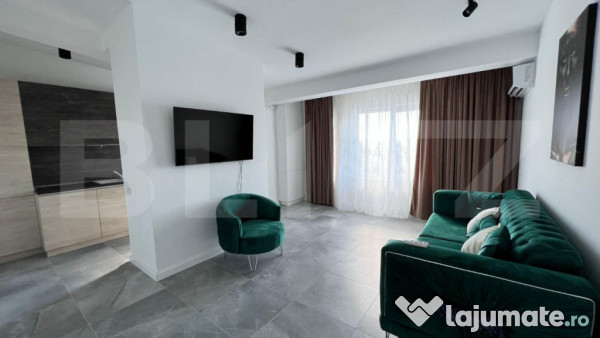 Este dotat cu centrala termica proprie cu incalzire in pardoseala, aer conditionat, Tv Smart, Wifi, masina de spalat haine, usa metalica la intrare si geamuri termopan cu tamplarie din PVC.
