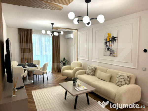 Apartamentul se afla la etajul 2/7, are o suprafata de 58 mp si 11 mp terasa cu o compartimentare moderna. Este compus din living, bucatarie separata, dormitor, baie si hol cu spatii de depozitare. In plus are o terasa acoperita de aproximativ 11 mp amenajata modern. Apartamentul se preda conform fotografiilor, finisat si mobilat LUX. Pe langa finisajele si mobilatul modern acesta dispune de geamuri termopan triple de calitate, jaluleze, usa metalica la intrare, iar încălzirea este prin pardoseala pentru extra confort.