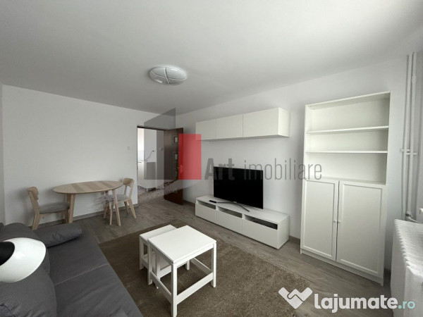 Apartamentul este proaspat igienizat si renovat, se afla la prima inchiriere, baia este complet refacuta iar mobilierul si electrocasnicele sunt noi-noute. Proprietatea are 2 camere (living si dormitor), bucatarie complet mobilata si utilata, un balcon micut dar cu vedere frumoasa si o debara generoasa cu masina de spalat rufe.